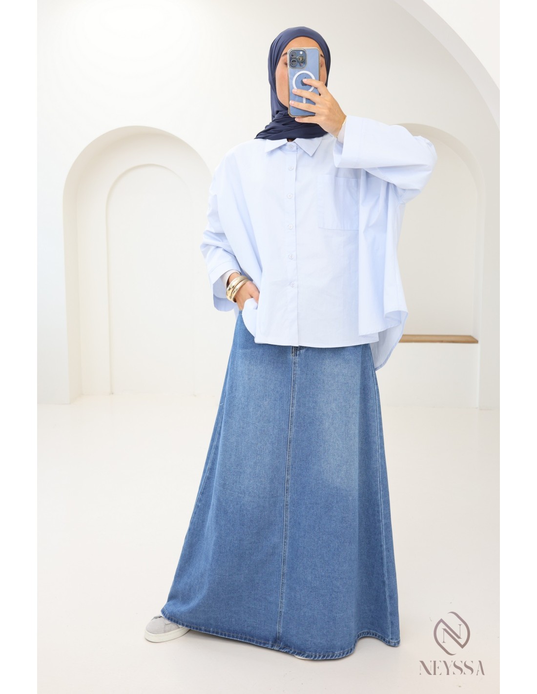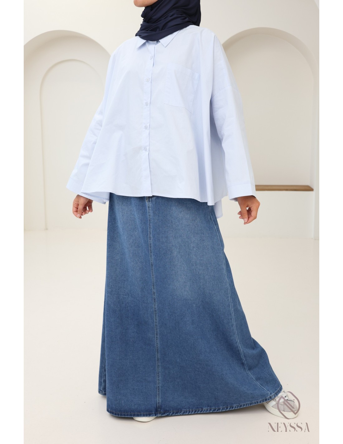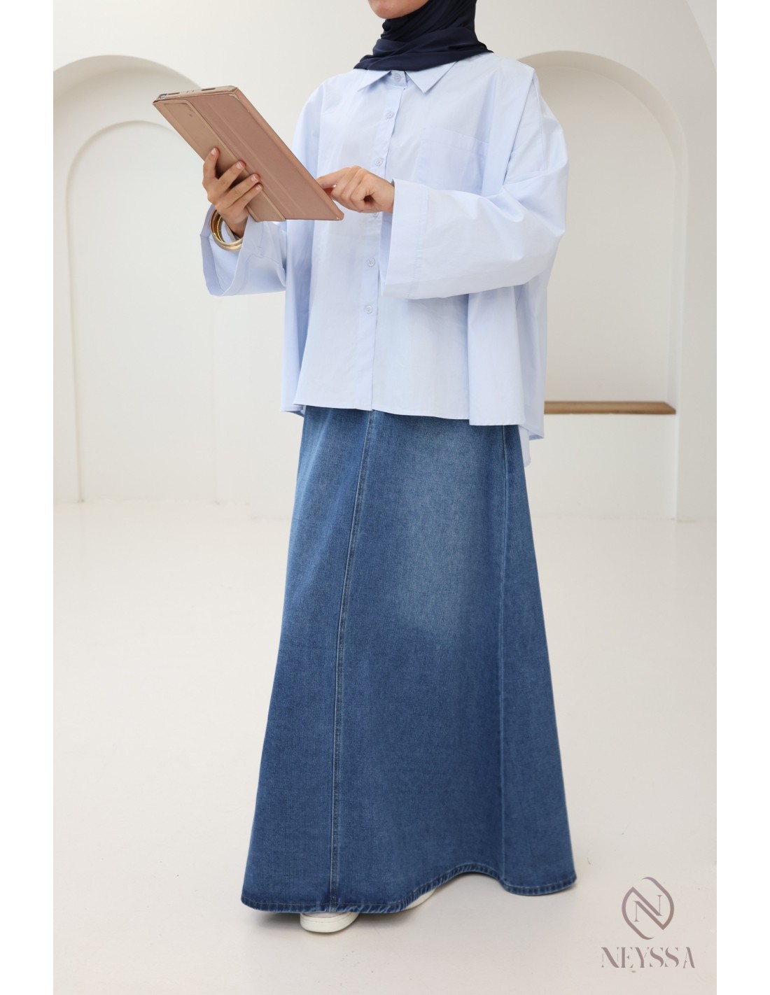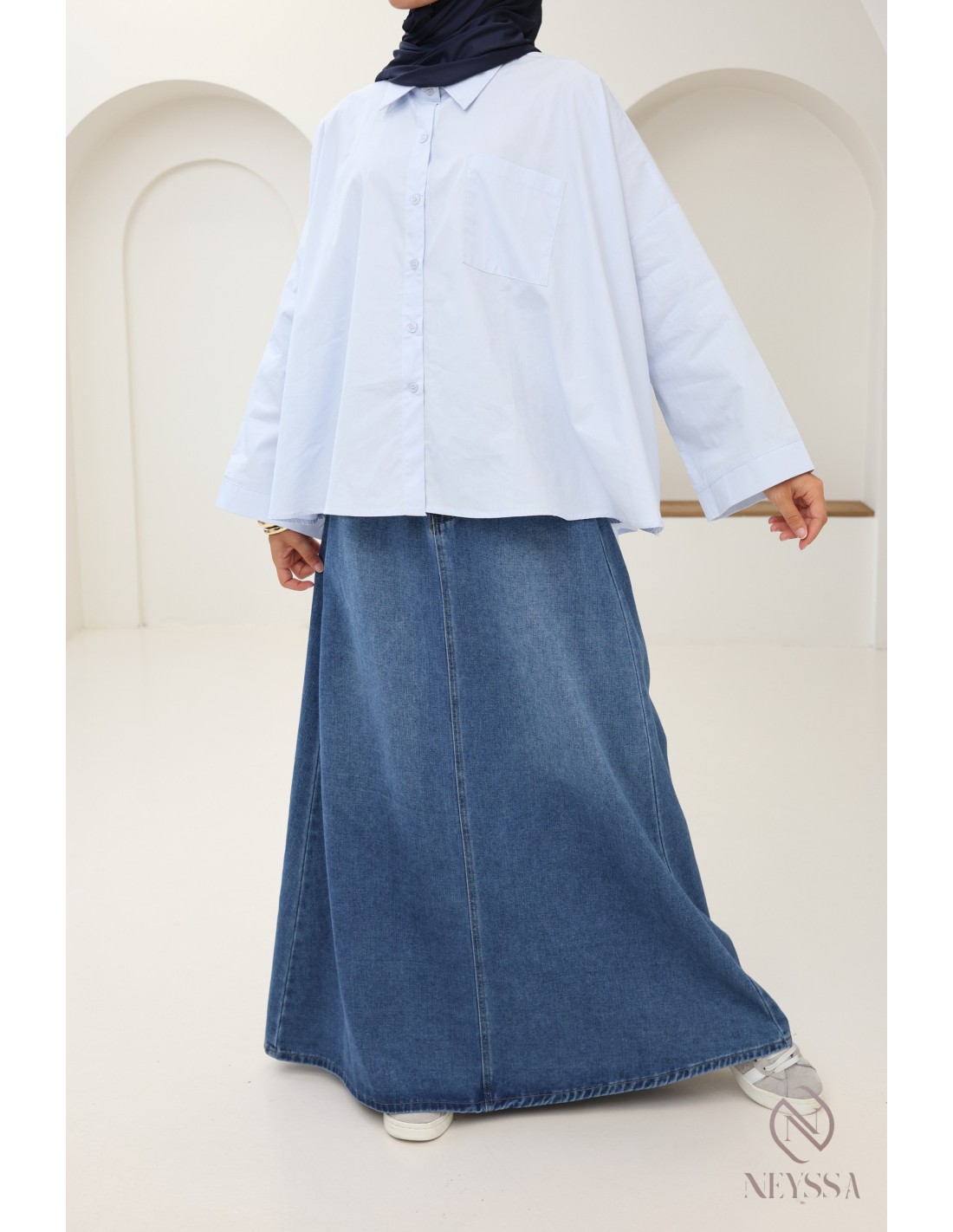 Vous êtes à la recherche d'une jupe en jeans qui ne soit ni fendue ni moulante pour compléter votre garde robe mastoura ?