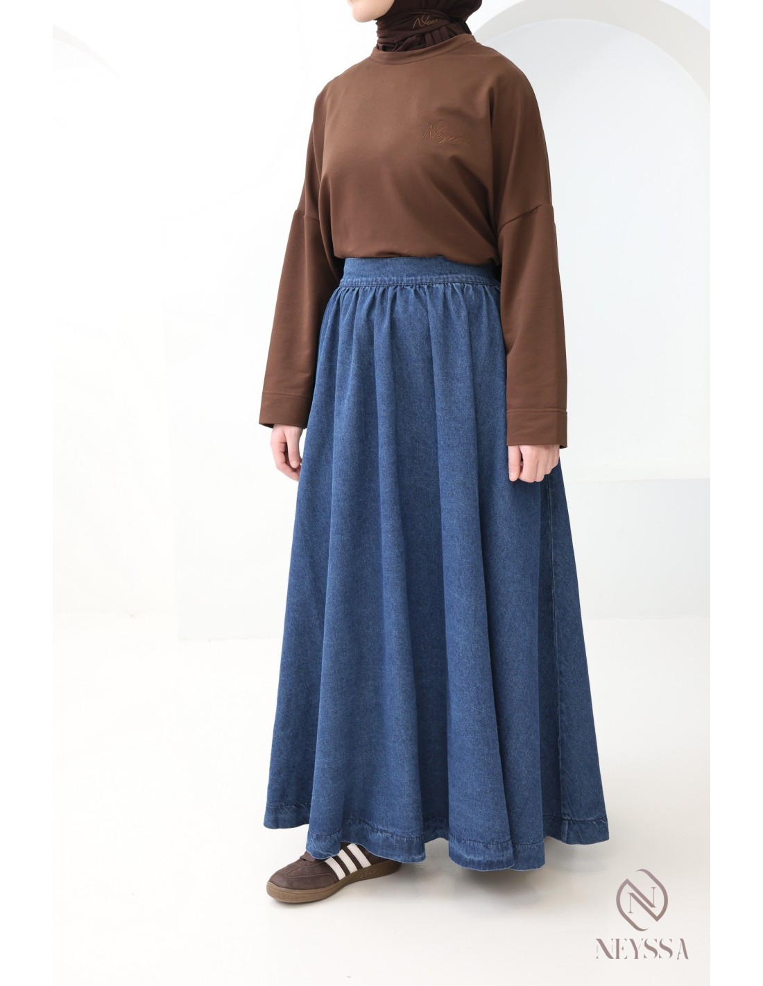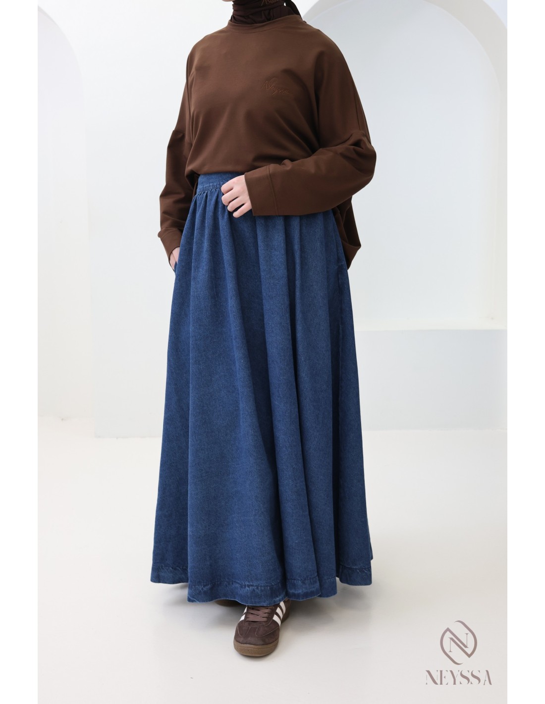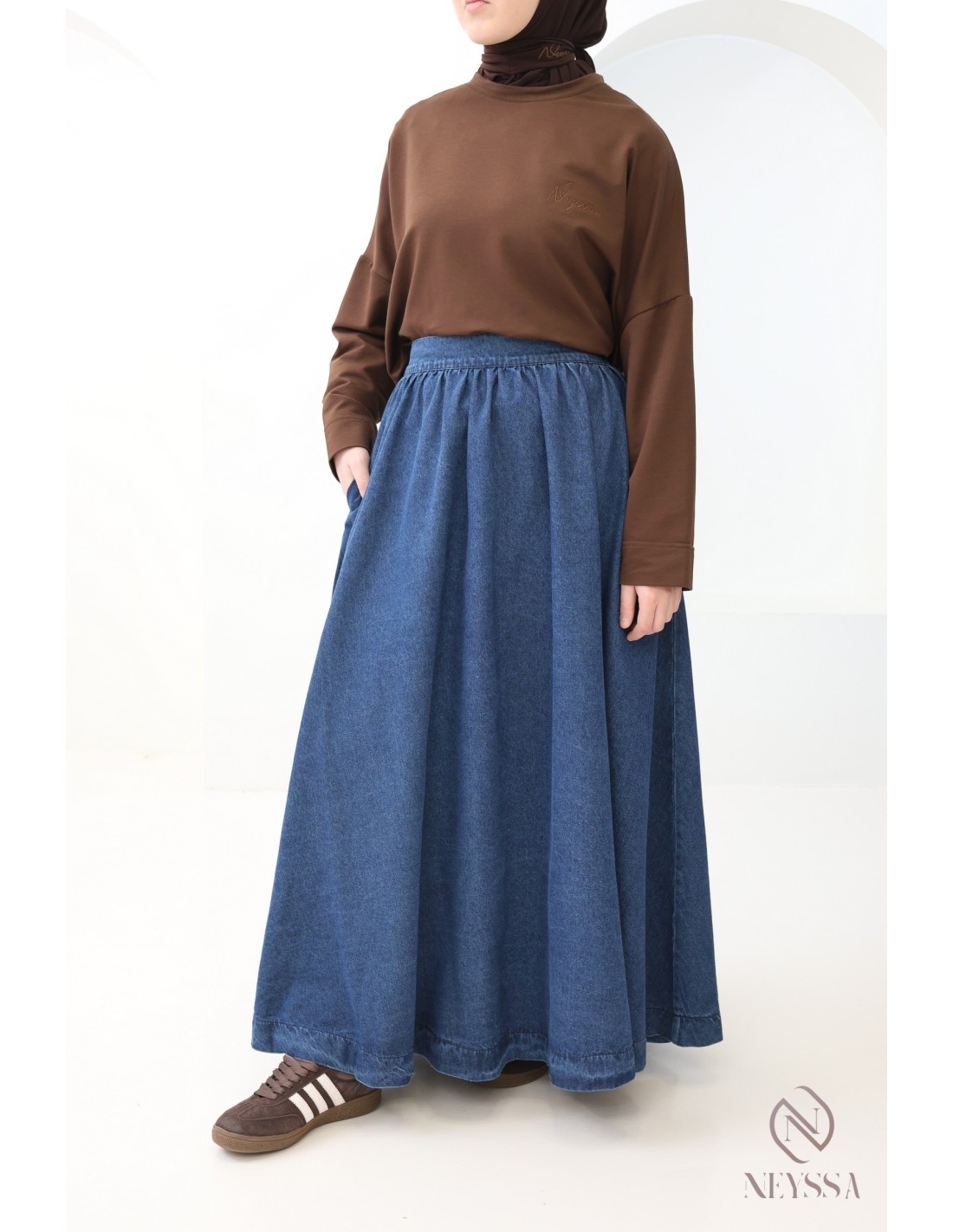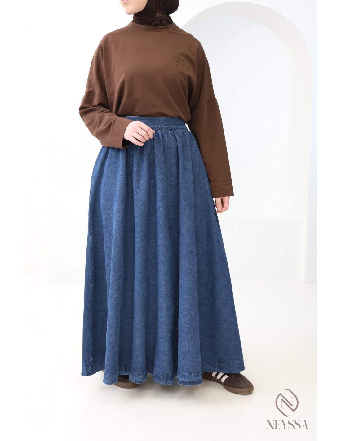 Vous êtes à la recherche d'une jupe en jeans qui ne soit ni fendue ni moulante pour compléter votre garde robe mastoura ?