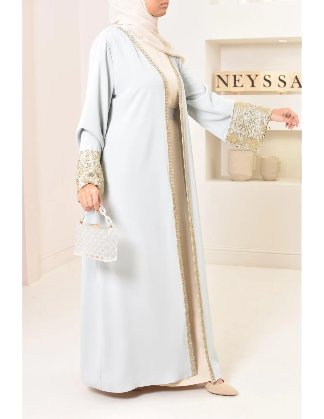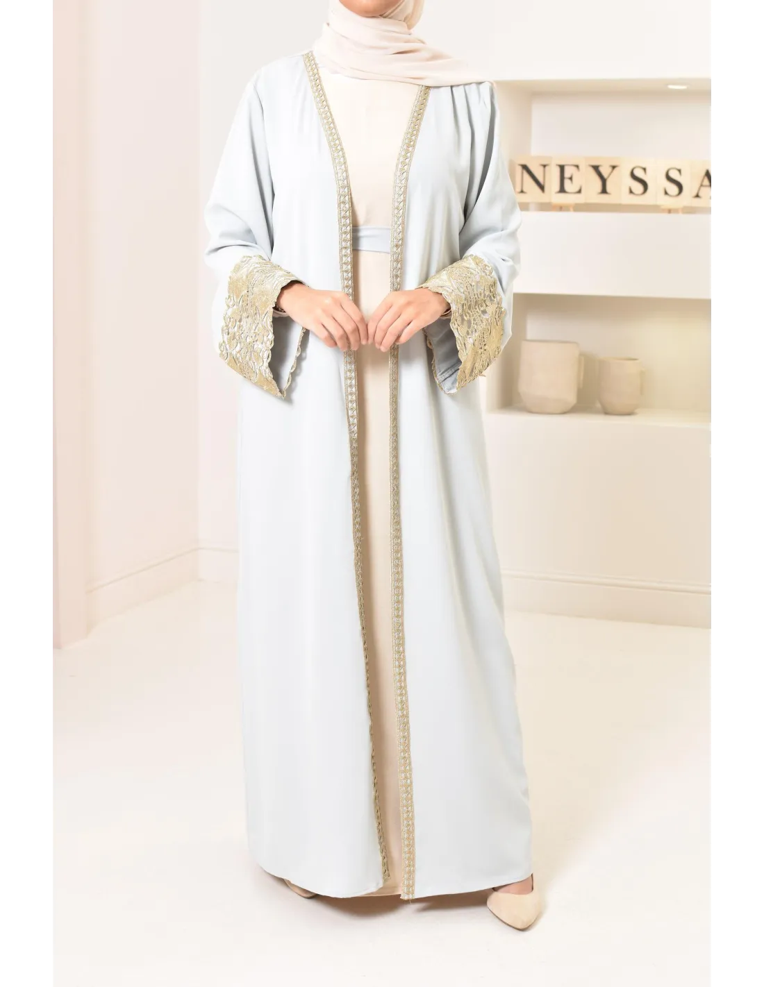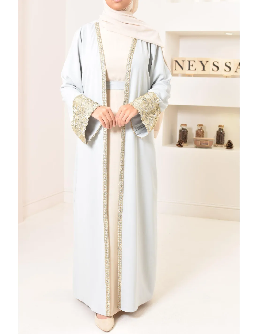 Nous vous proposons ce sublime kimono long fluide en mousseline pour vos fêtes de l'Aïd et vos évènements. Finitions  manches tulipe avec détails de broderies qui font tout le charme de cette pièce.