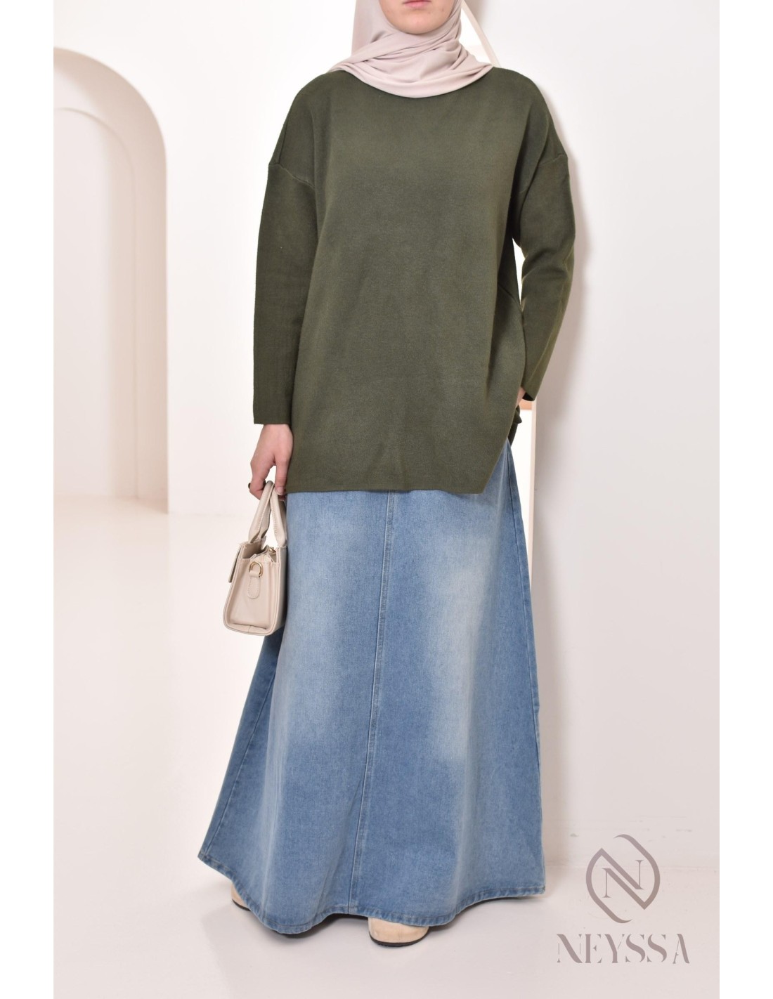 • Look décontracté : Associez le pull à une jupe en jean longue et évasée. Ajoutez un hijab assorti pour un style casual chic, parfait pour les journées détendues. Complétez avec des baskets ou des mocassins pour plus de confort.