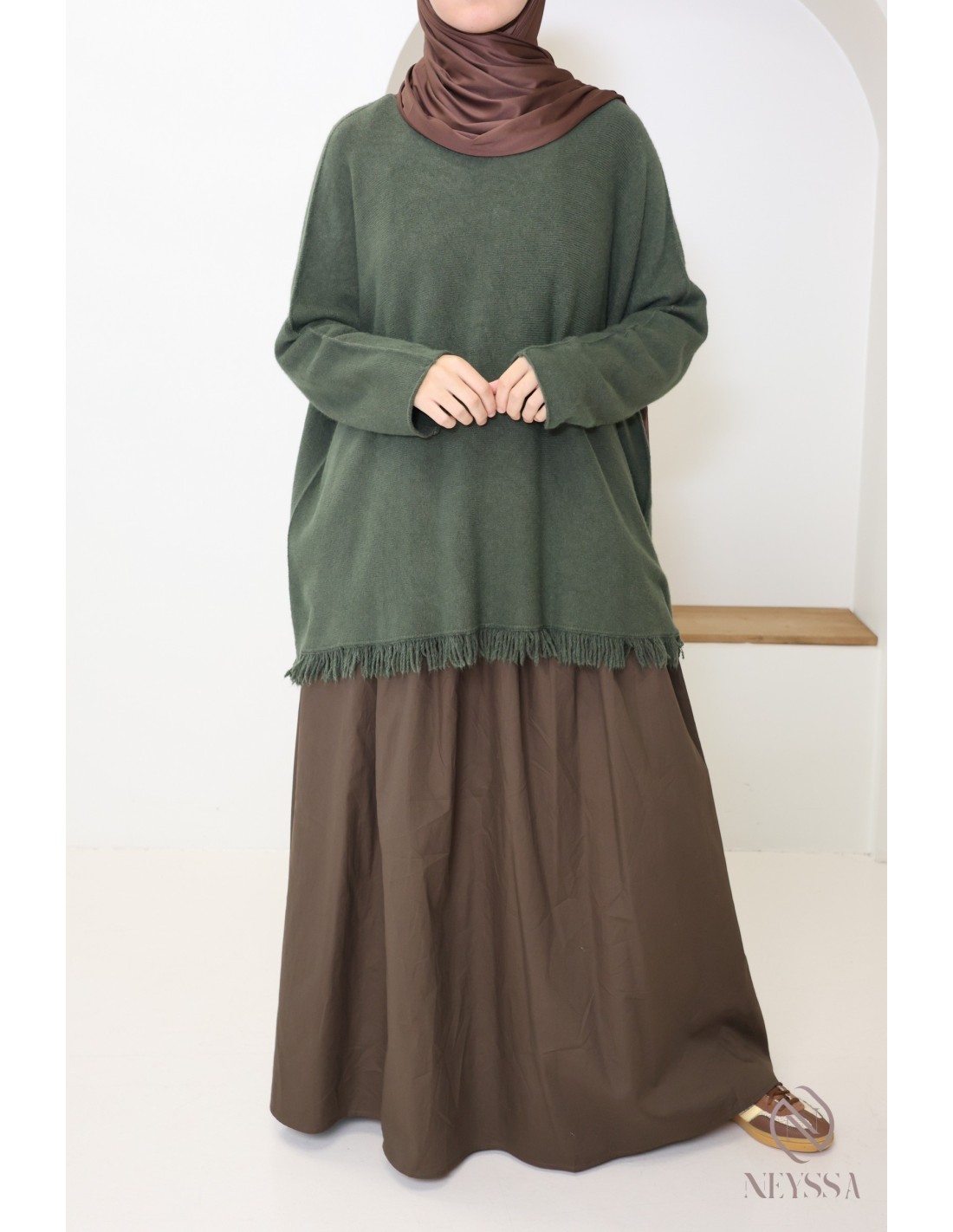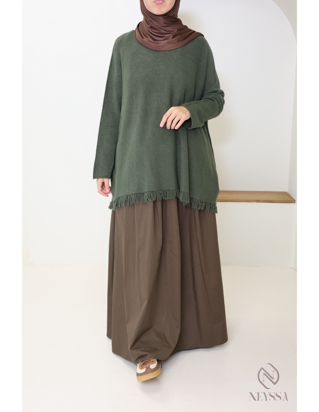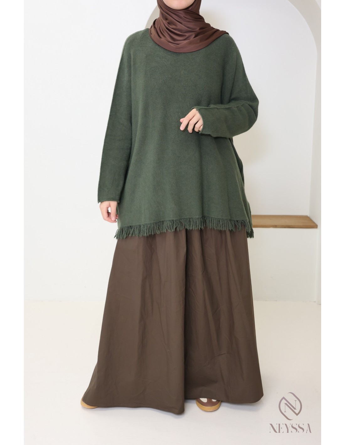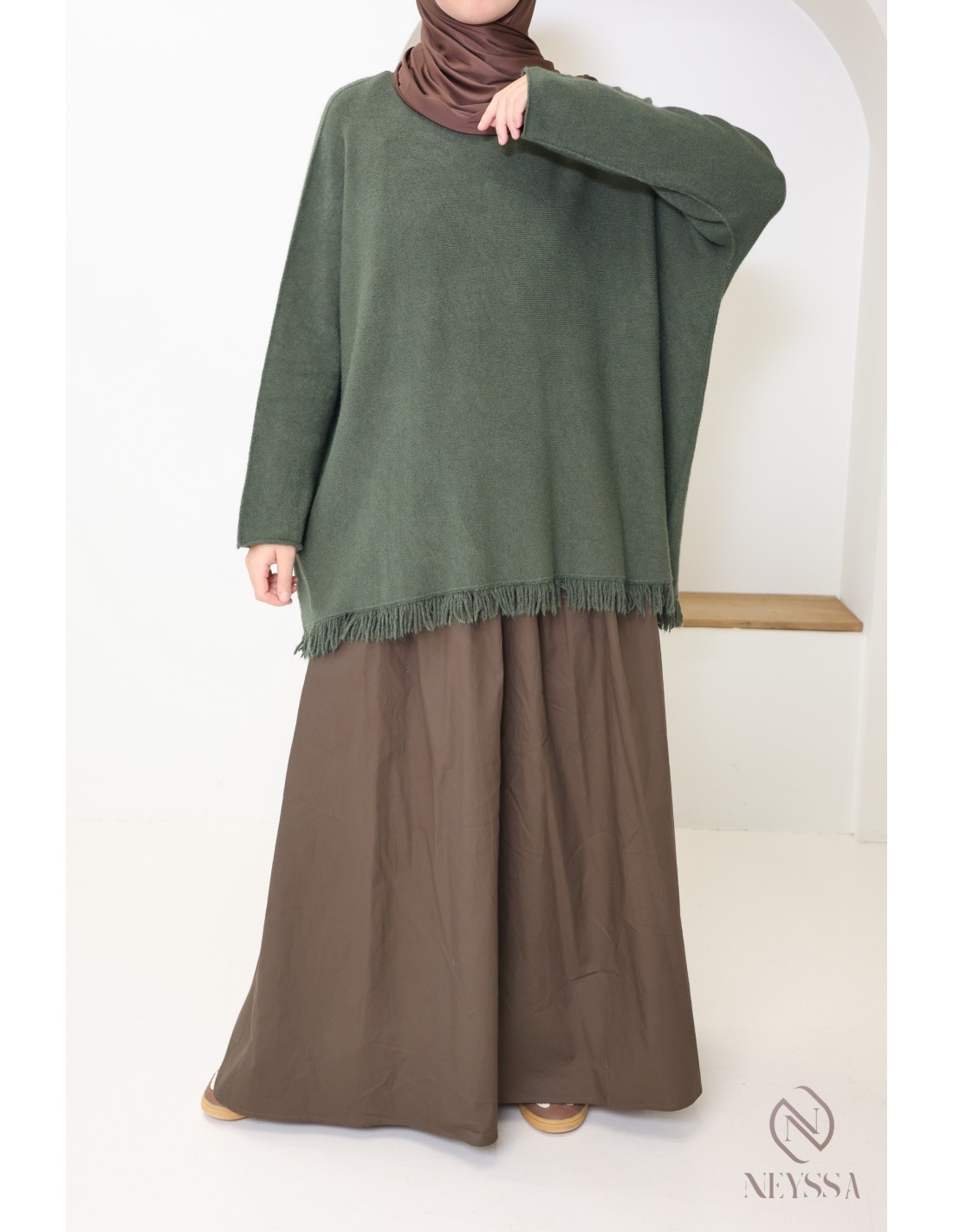 Pull en maille mi long pour femme hijabi tendance avec franges