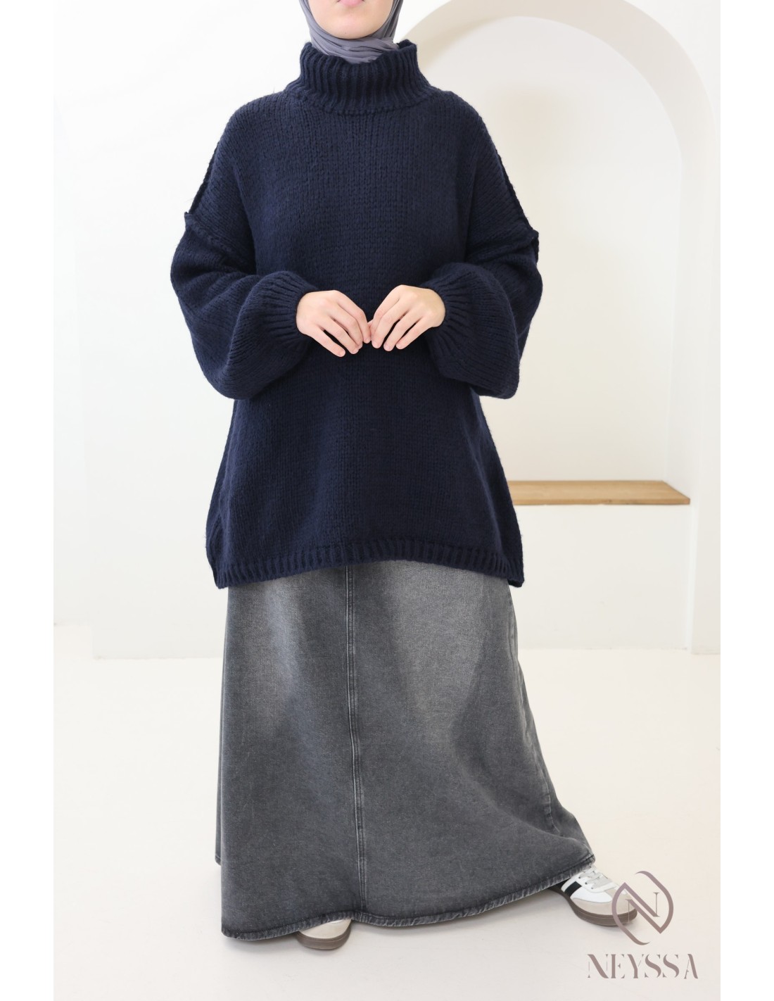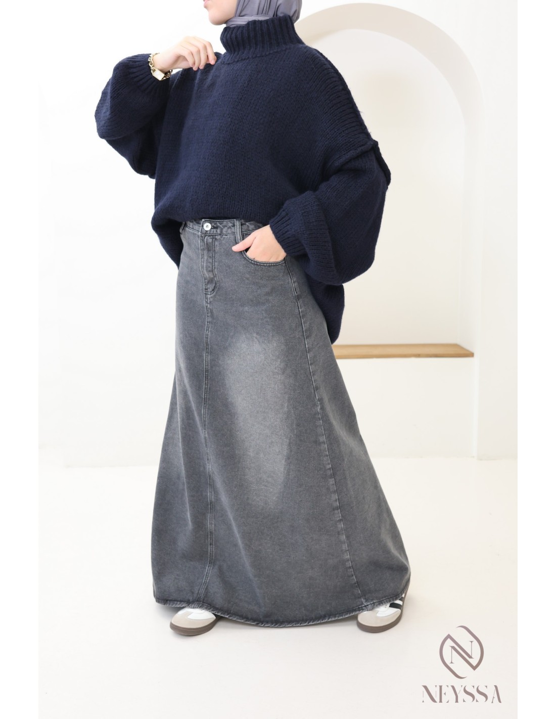 • Look décontracté : Associez le pull oversize à une jupe en jean longue et évasée. Ajoutez un hijab assorti pour un style casual chic, parfait pour les journées détendues. Complétez avec des baskets ou des mocassins pour plus de confort.