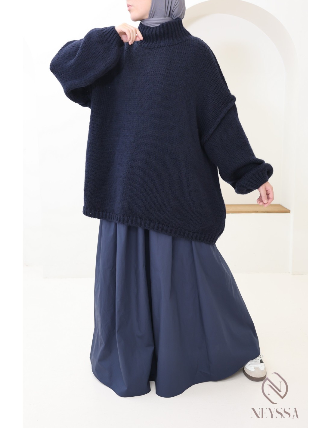 • Style élégant : Pour un look plus raffiné, associez le pull à une jupe plissée fluide dans des tons neutres. Optez pour des bottines à talons et un hijab pour une touche sophistiquée. Un sac structuré complétera parfaitement cette tenue.