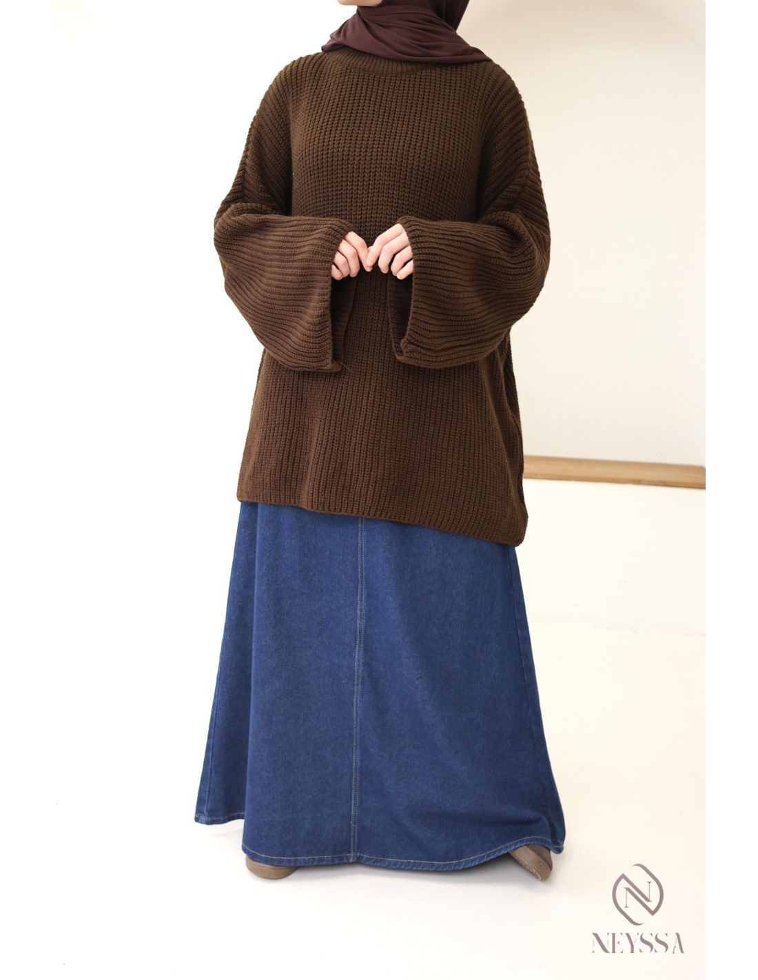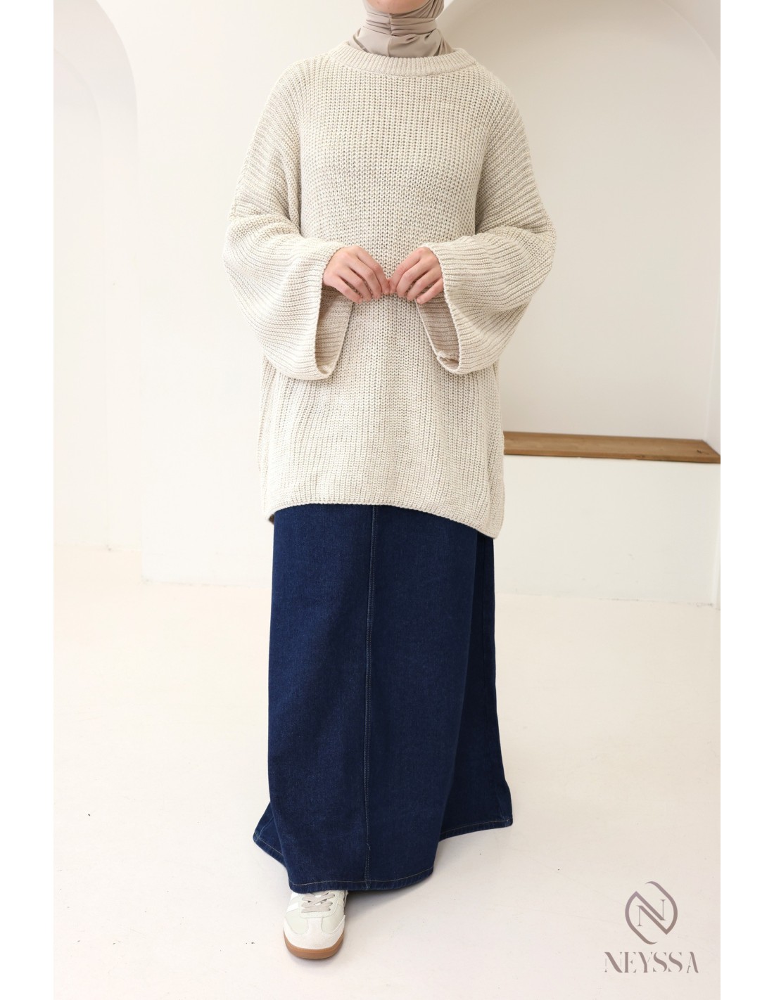 • Look décontracté : Associez le pull oversize à une jupe en jean longue et évasée. Ajoutez un hijab assorti pour un style casual chic, parfait pour les journées détendues. Complétez avec des baskets ou des mocassins pour plus de confort.
