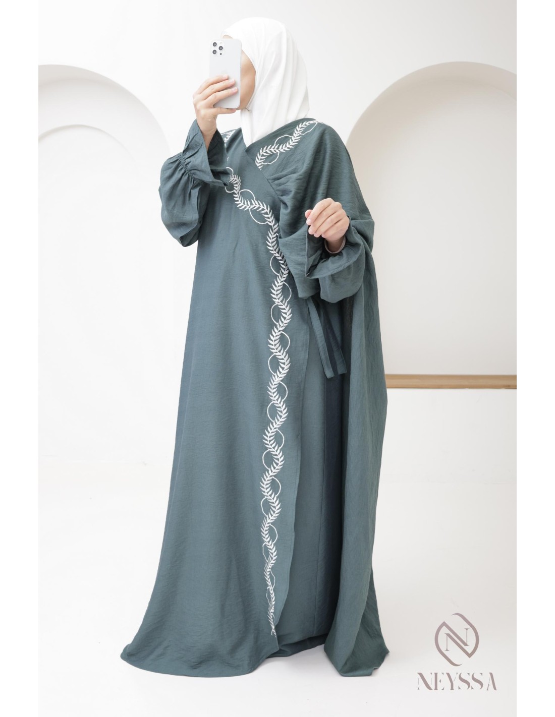 Abaya hijab intégré vert en effet lin avec broderie, made in UAE