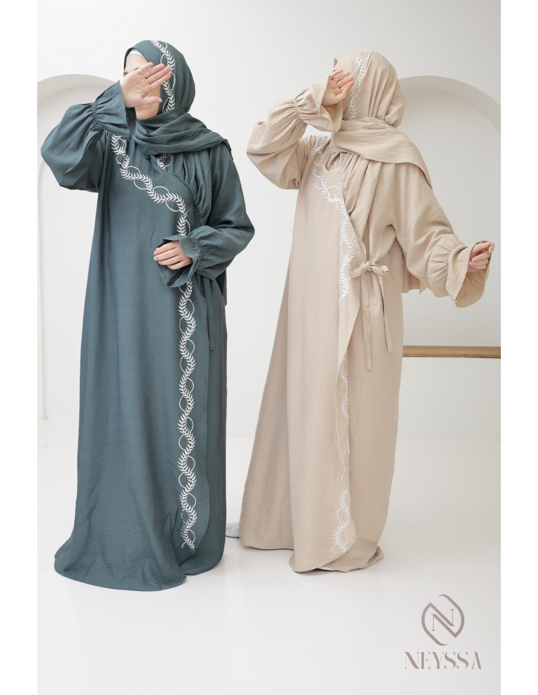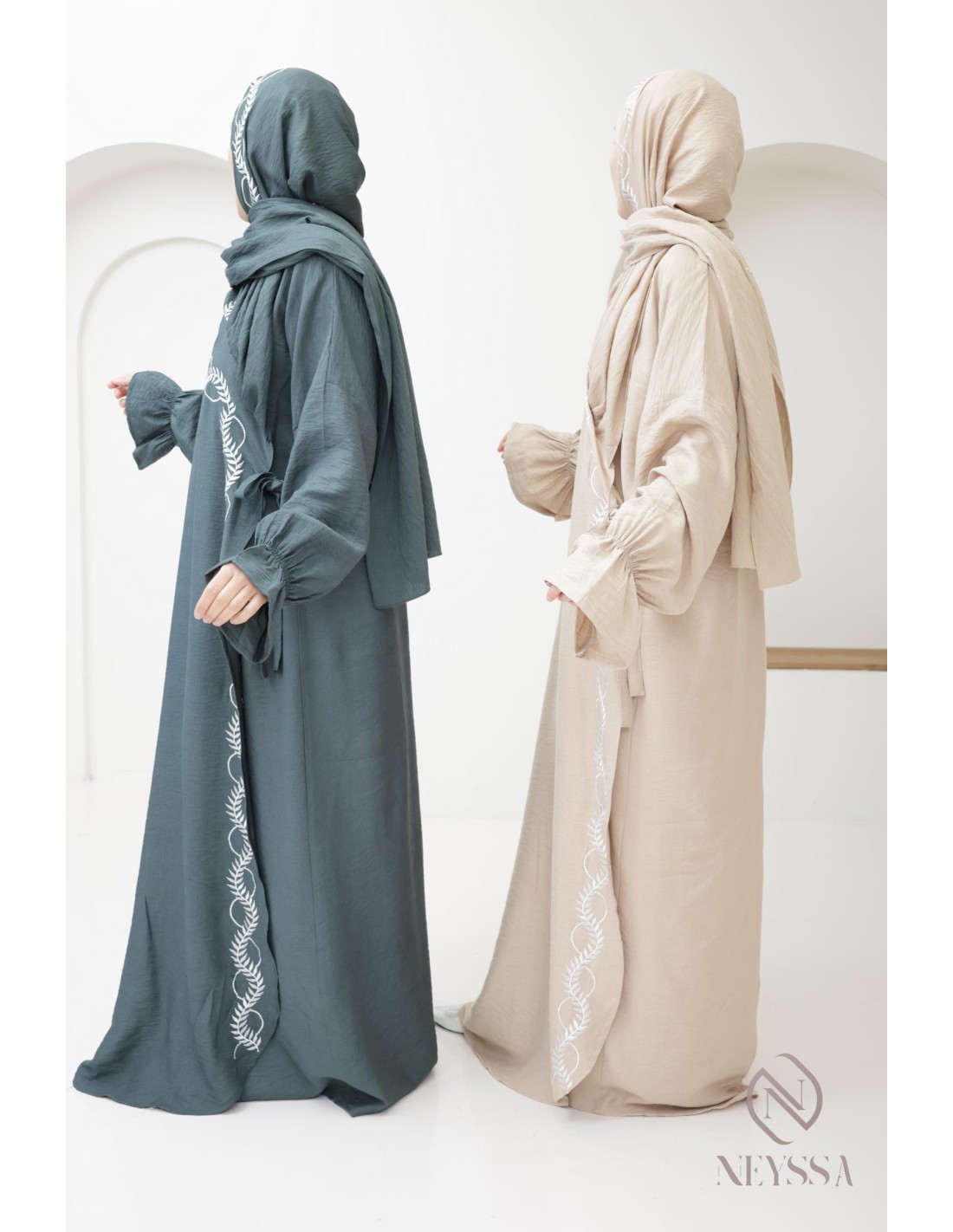 - Hijab intégré : la abaya possède un hijab cousu avec de la broderie sur toute sa longueur. Après avoir fermée la robe, vous n'aurez qu'à enrouler le hijab autour de votre tête comme un hijab normal !