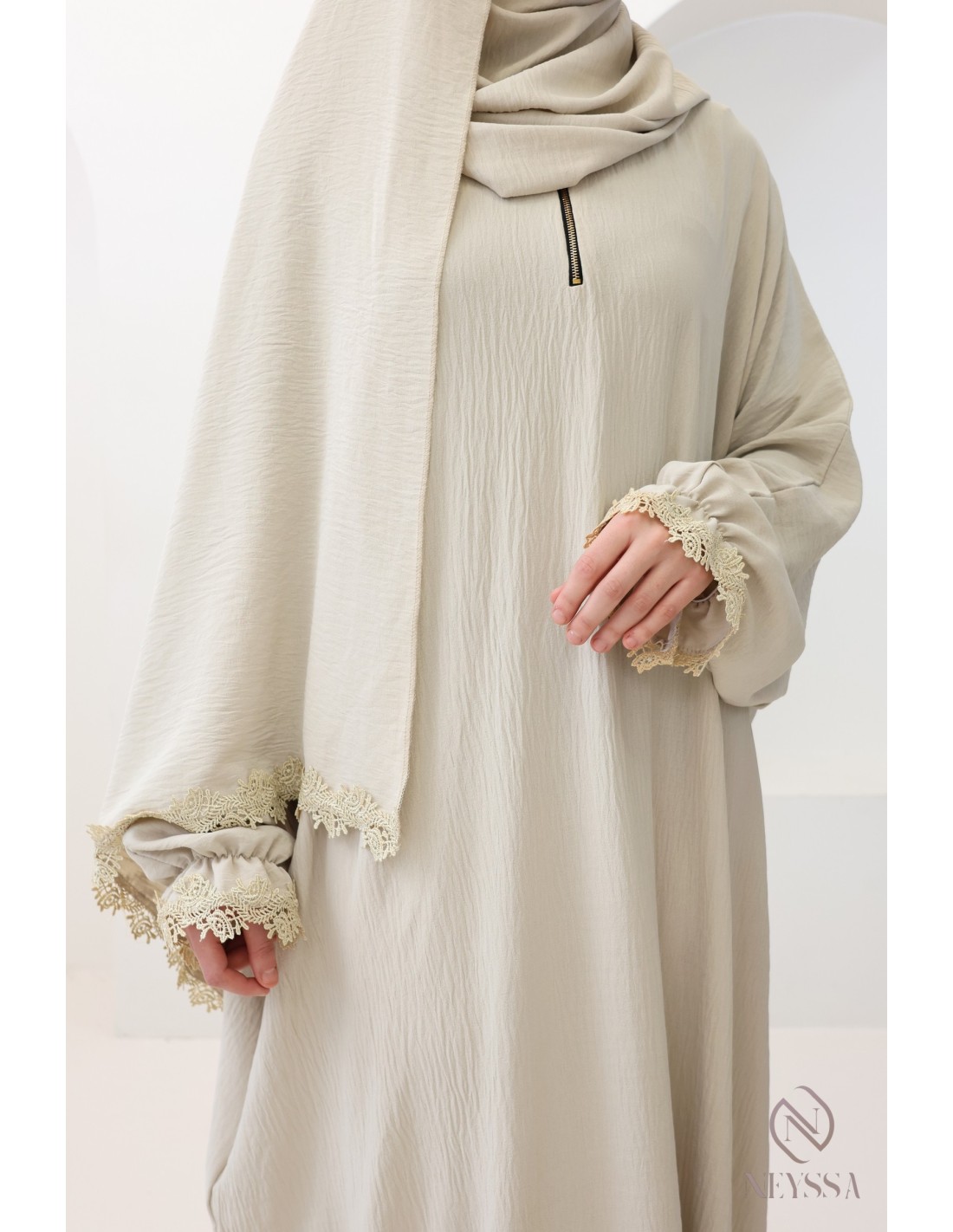 - Broderie style orientale : de jolis motifs en dentelles ornent les poignets de la robe ainsi que l'extrémité du hijab apportant une touche d'élégance et d'originalité à la pièce.