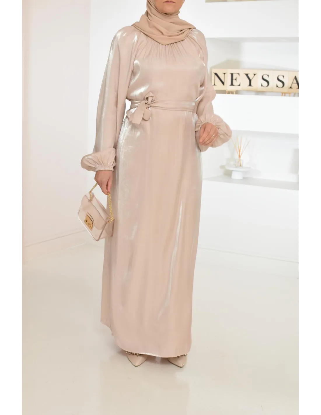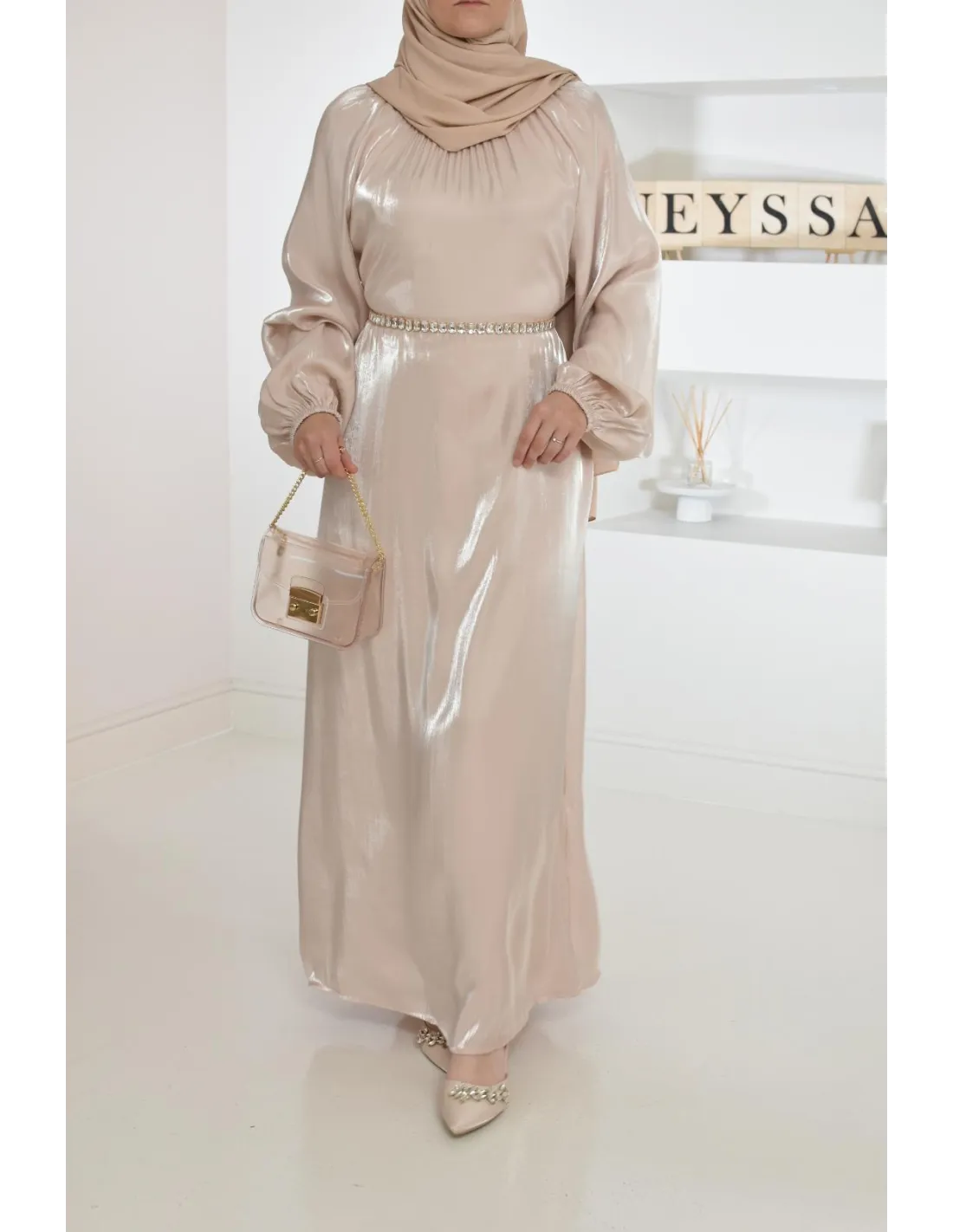 Retrouvez cette longue robe effet organza au tissu irisé et à la coupe modeste.
