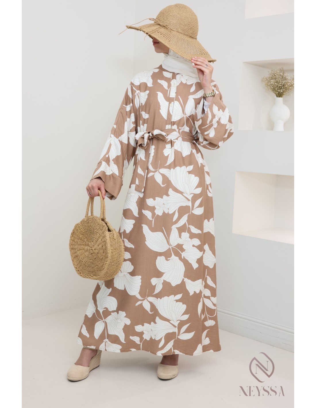 Abaya à imprimé floral, tissu effet lin léger