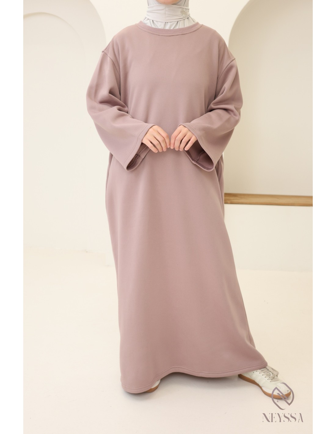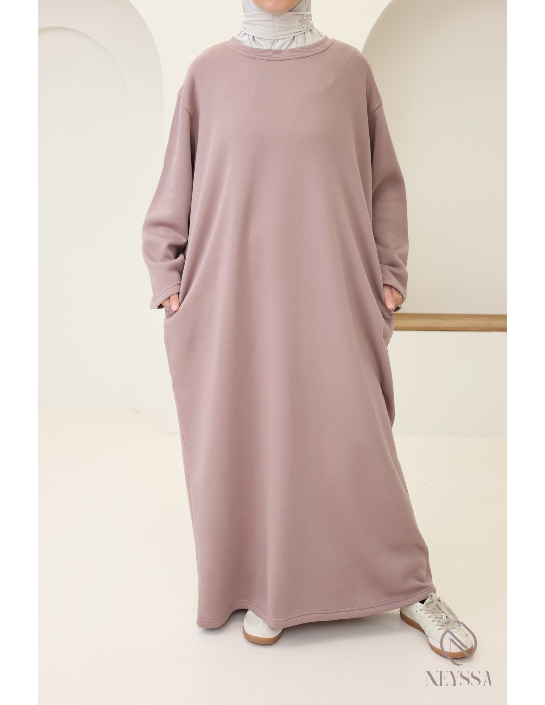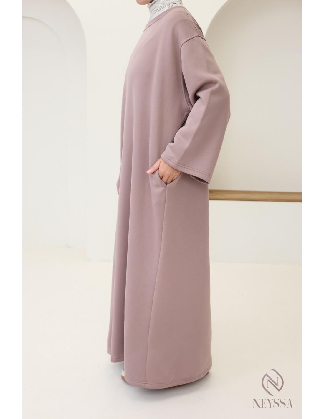 Voici une superbe robe longue molletonnée, à la fois moderne et confortable. C'est la pièce essentielle à porter les journées fraîches. Conçue pour répondre aux besoins de chaleur, de style et de modestie, cette robe est idéale pour les femmes voilées moderne.