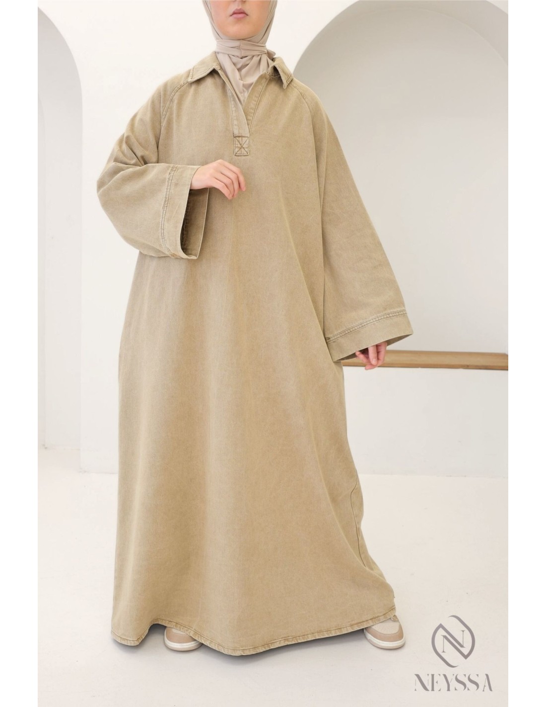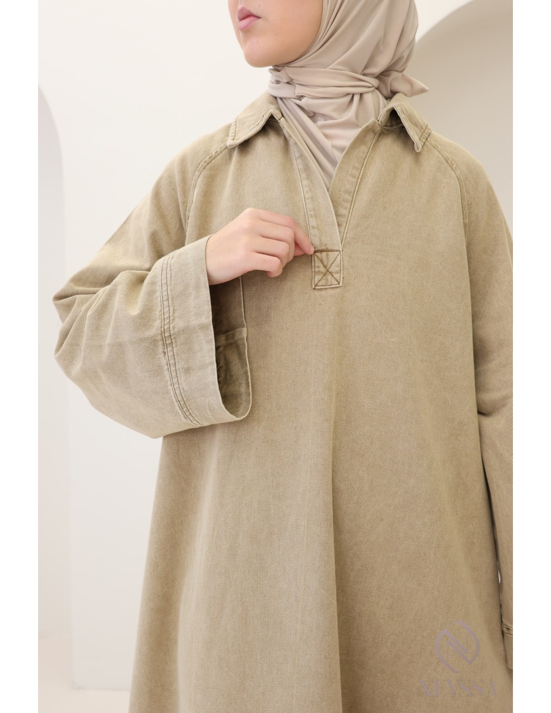 Robe longue en jean col chemise, 100% coton, look automne modeste