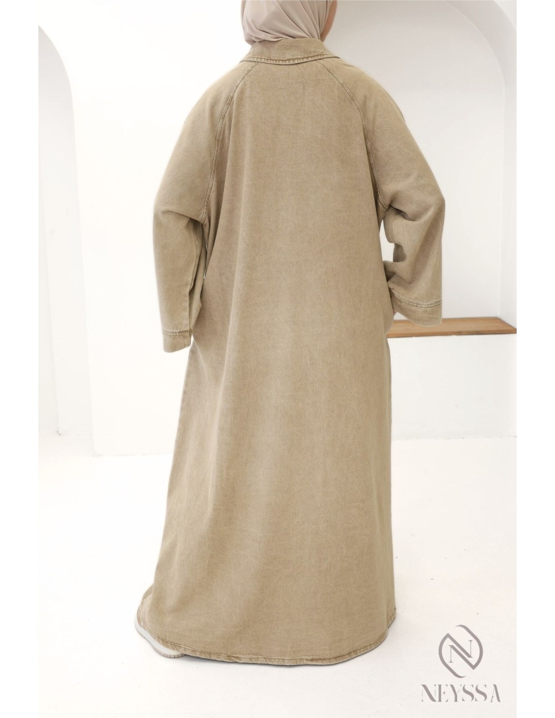 • Look urbain : Robe en jean ceinturée associée à un hijab noir, un trench long et des mocassins plats, pour une allure moderne et sophistiquée.