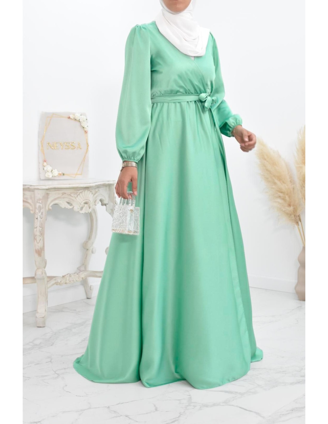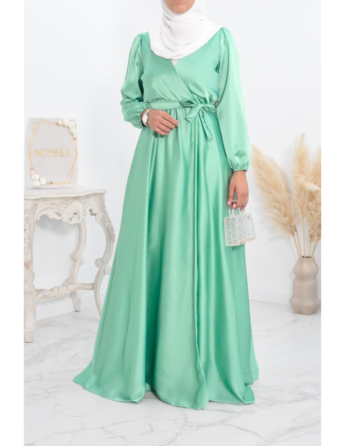 Jolie robe longue cache coeur, délicatesse, élégance sont de mise grâce à sa matière satinée.