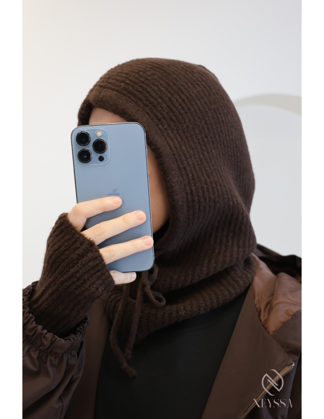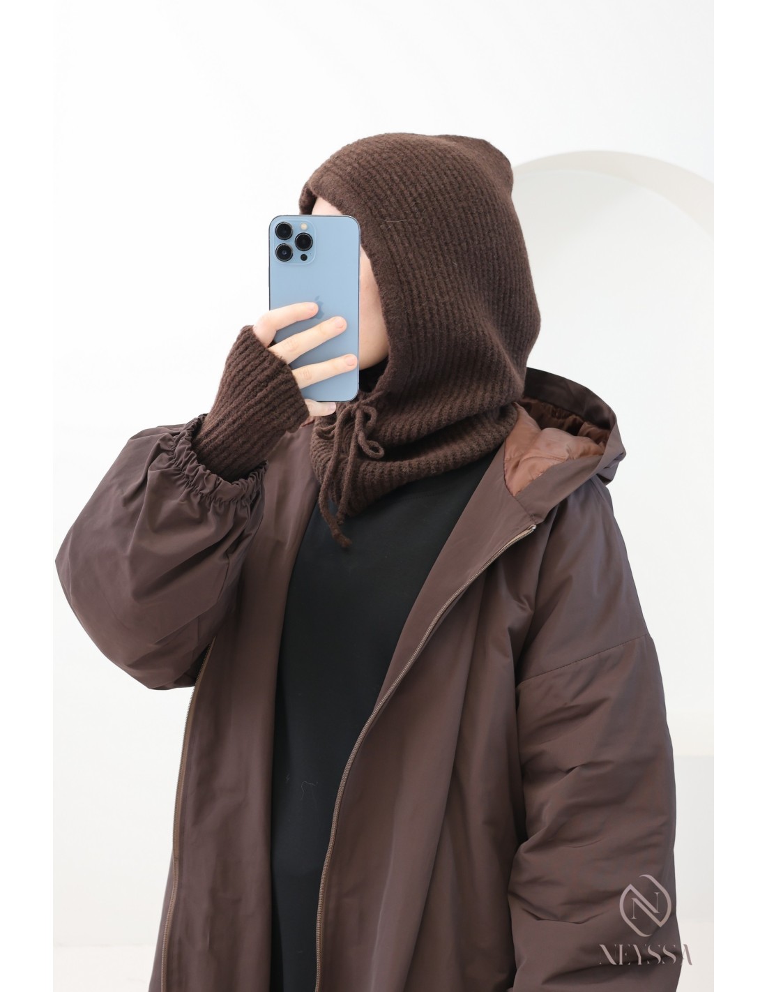 Neyssa vous propose cet ensemble ultra cosy composé d’une cagoule en maille assortie à ses mitaines longues, pensé pour allier chaleur, confort et style hijabi au quotidien.