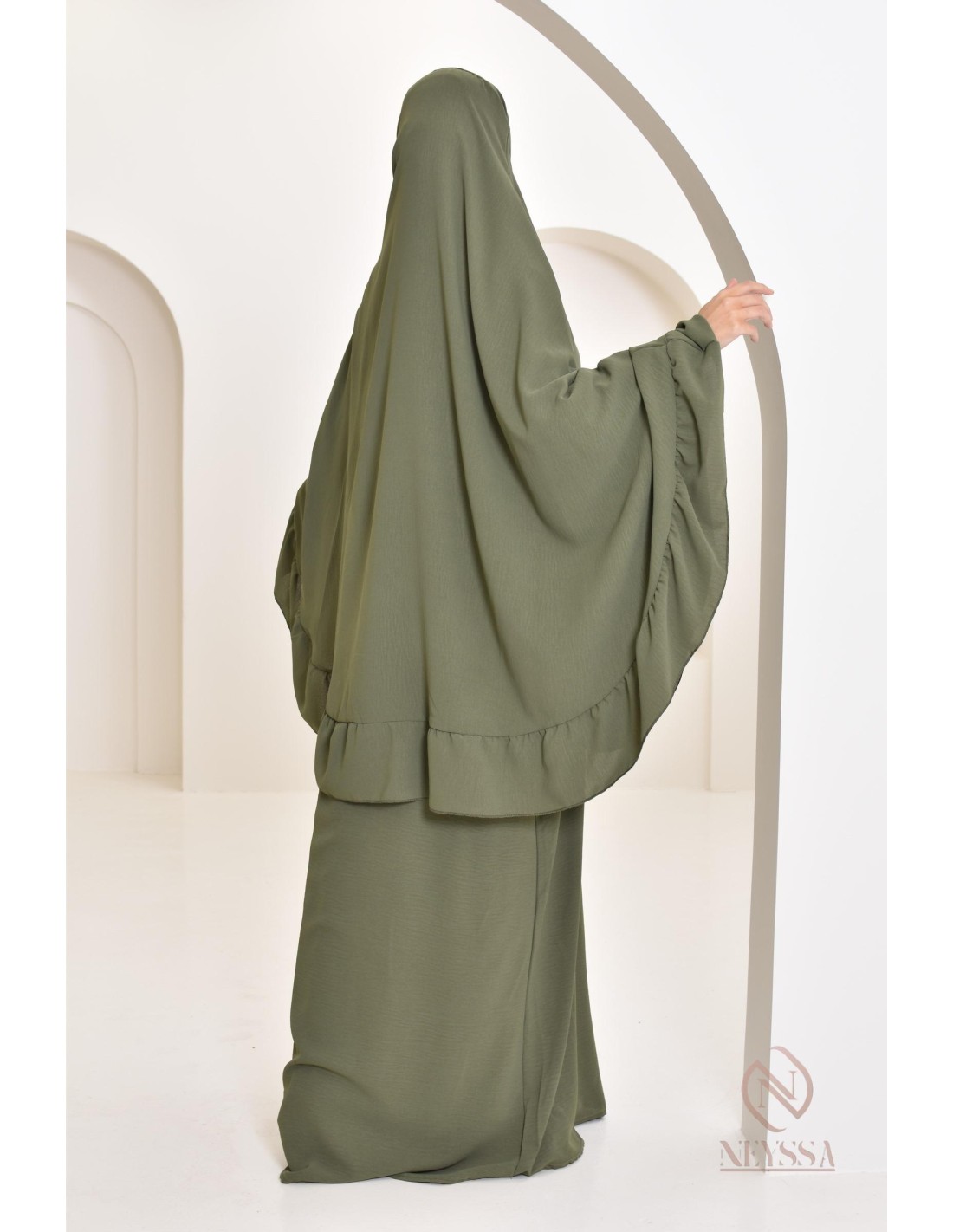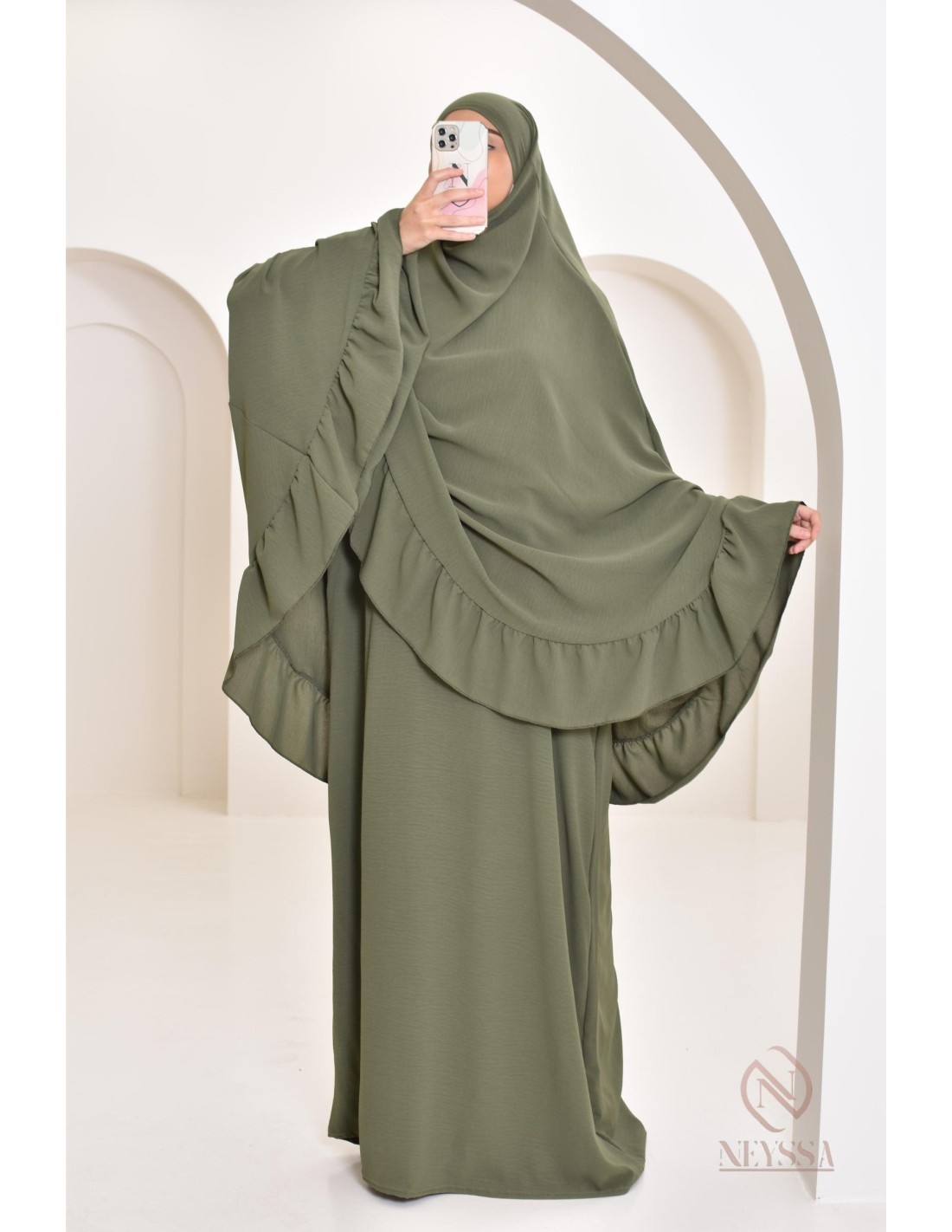 C'est le choix parfait pour toutes les femmes à la recherche d'une tenue à la fois légiférée, élégante et confortable. On craque pour ses détails de volants au niveau du khimar !