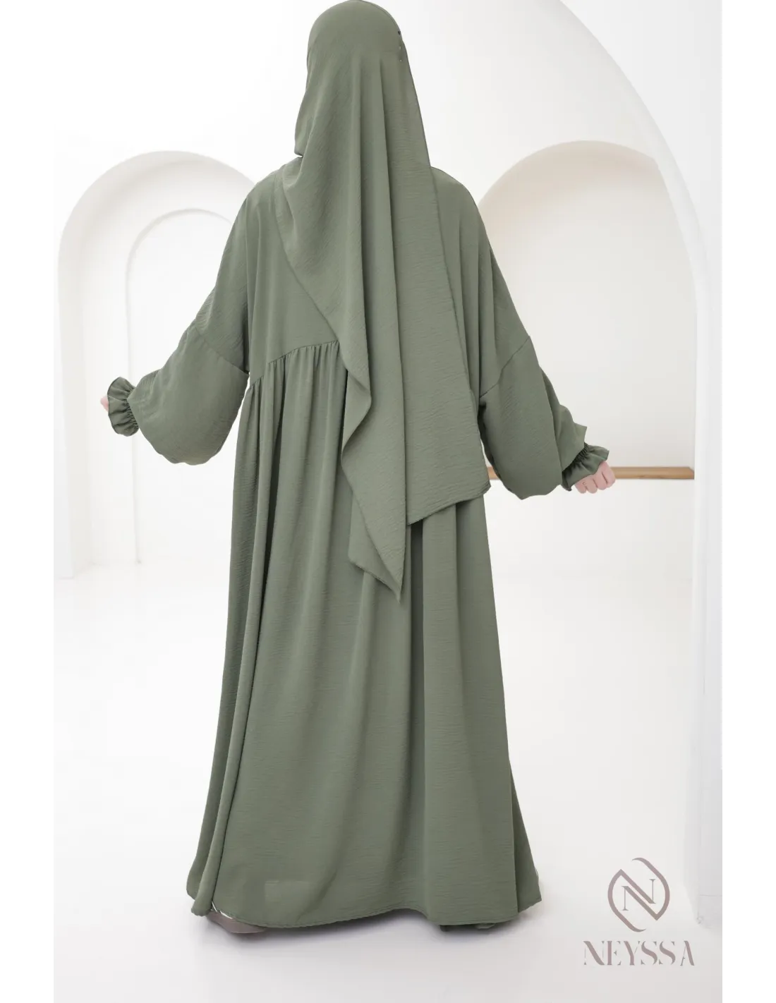 • Abaya avec Hijab intégré : la abaya possède un hijab cousu. Après avoir fermée la robe, vous n'aurez qu'à enrouler le hijab autour de votre tête comme un hijab normal !