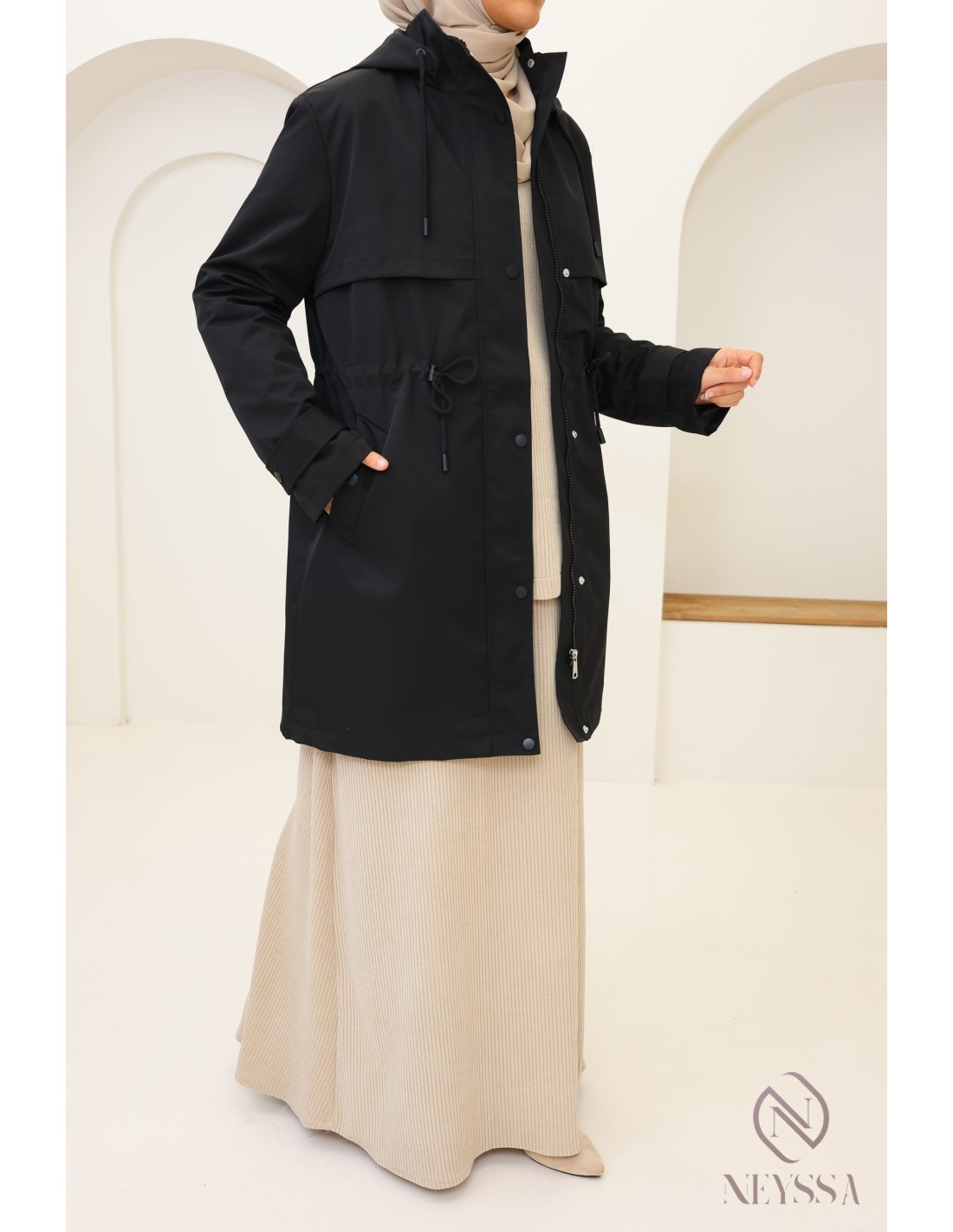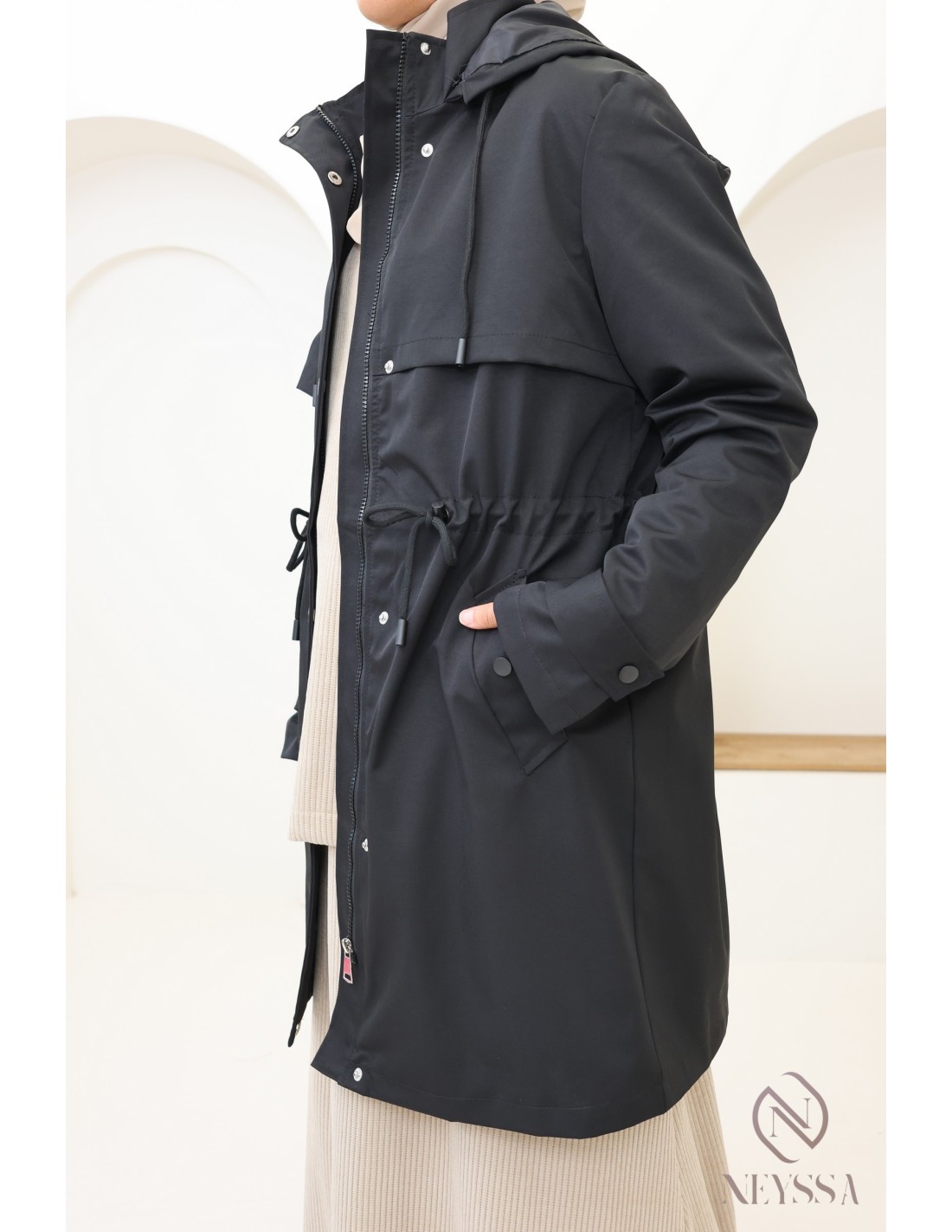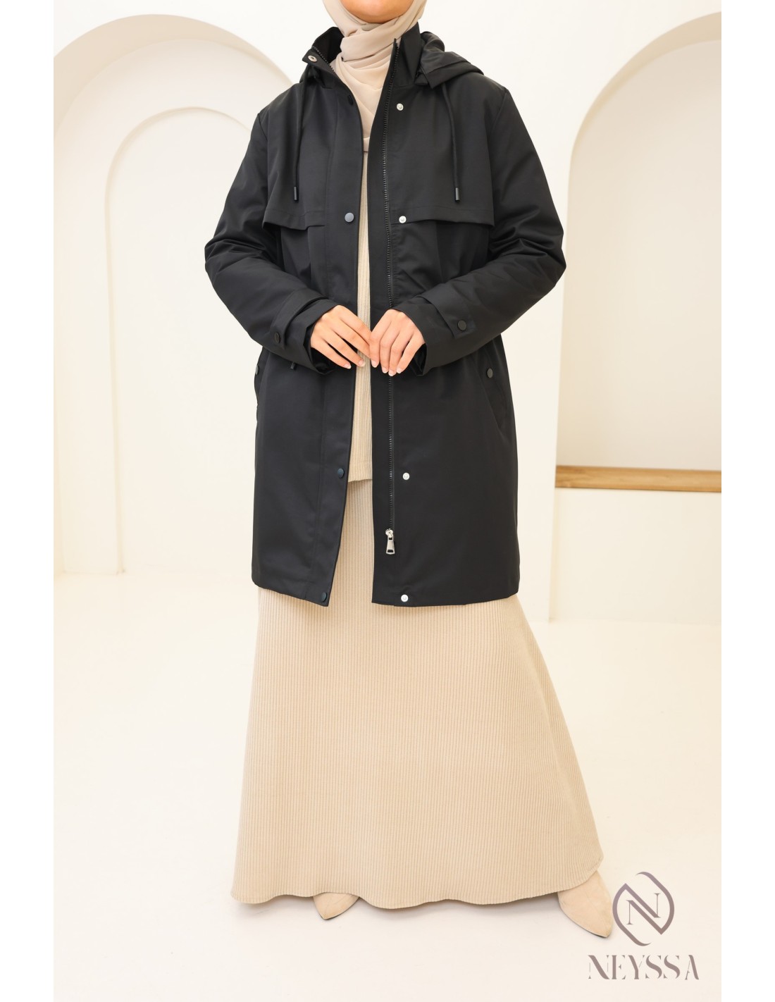 Parka Noir mi long pour femme hijabi moderne : tissu hydrofuge