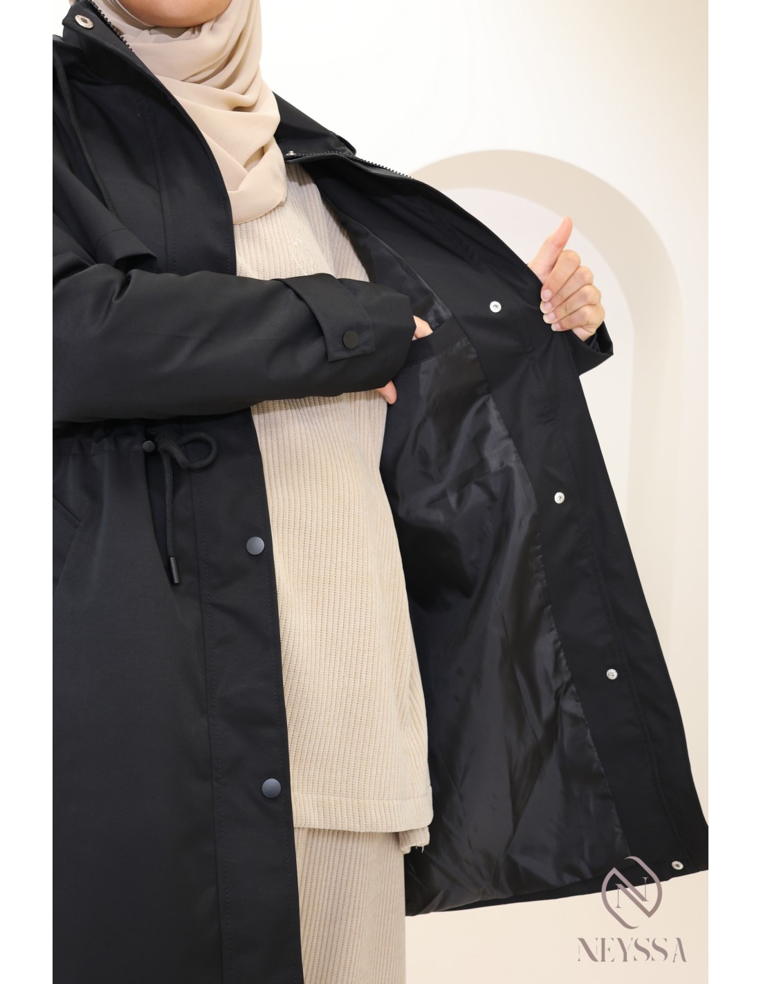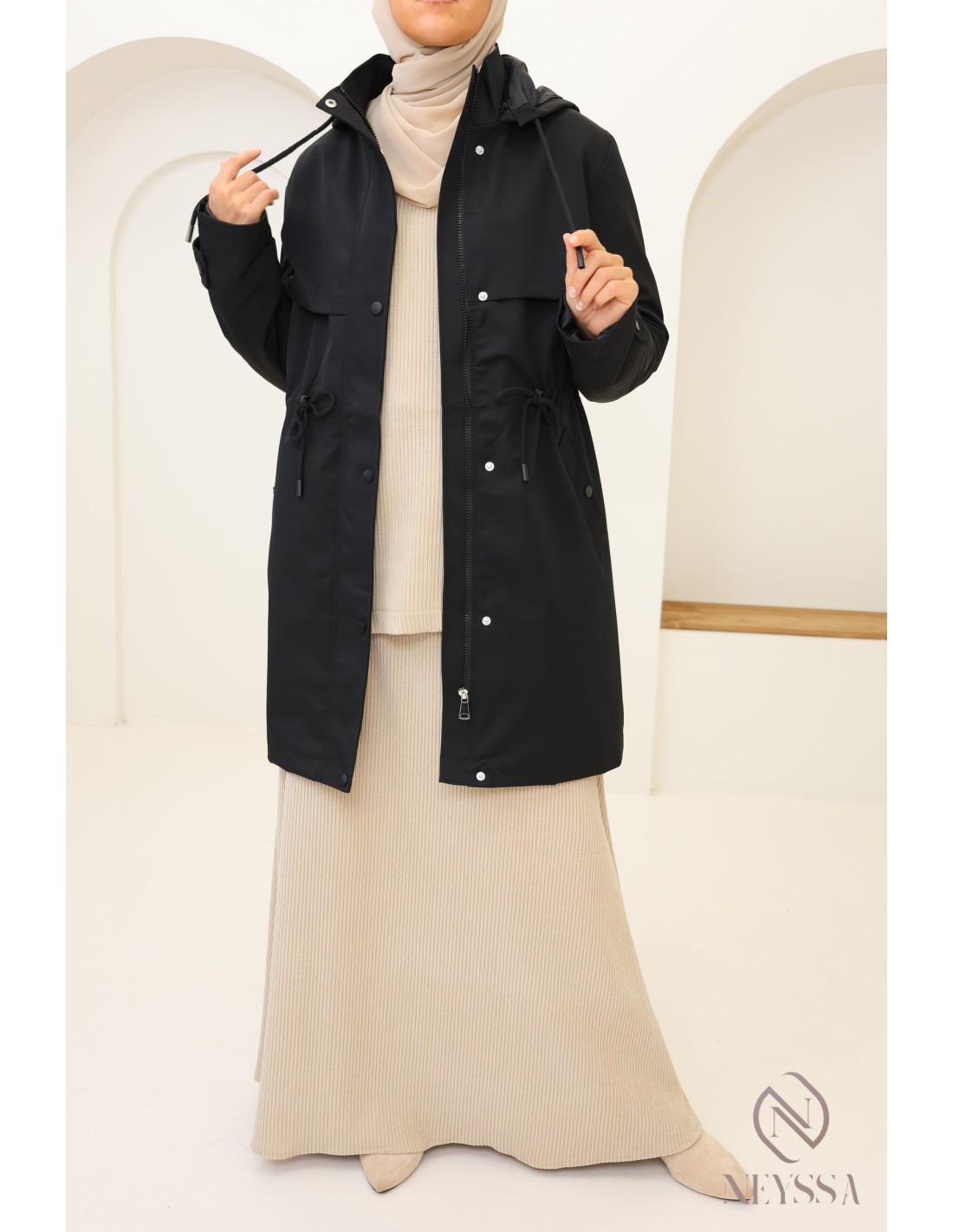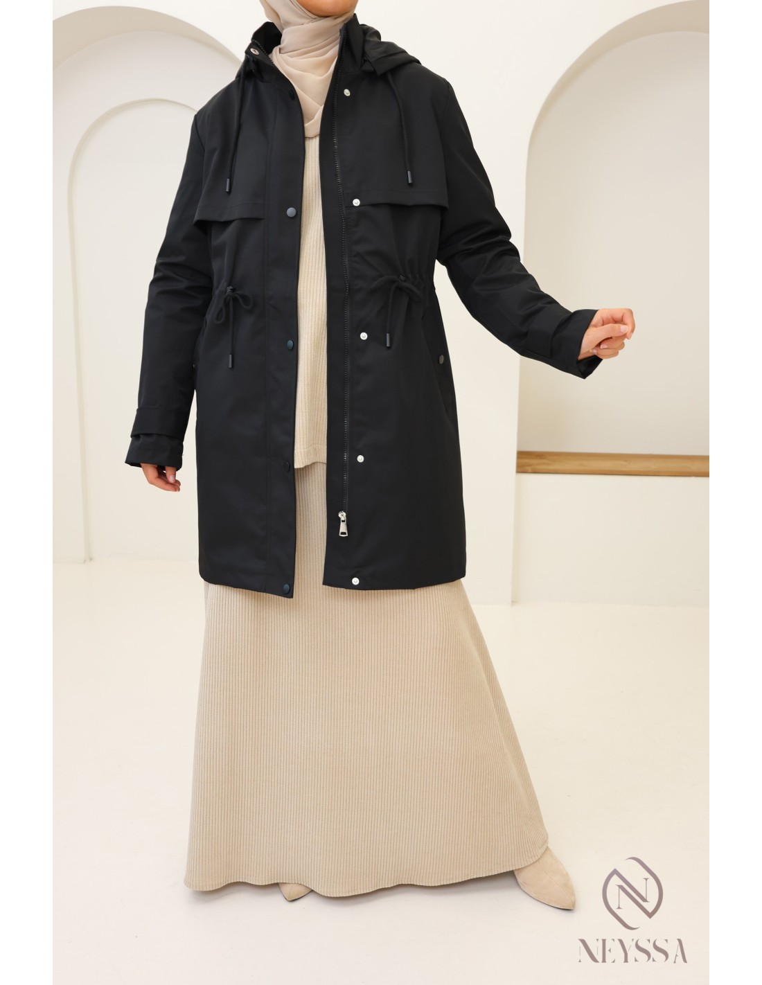 Parka Noir mi long pour femme hijabi moderne : tissu hydrofuge