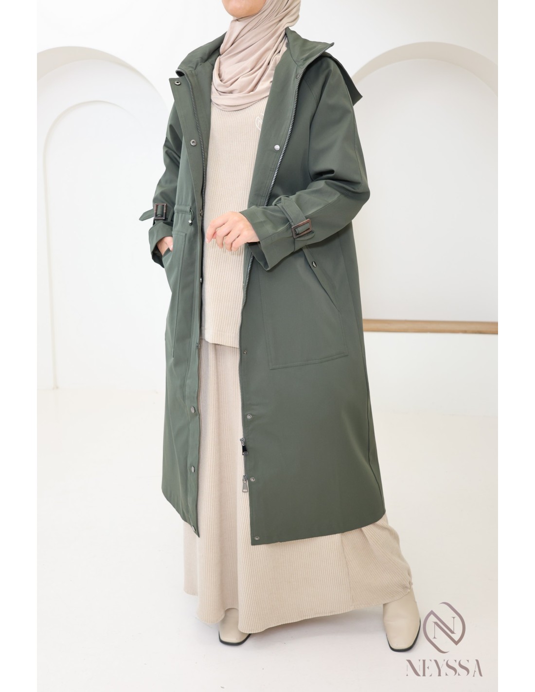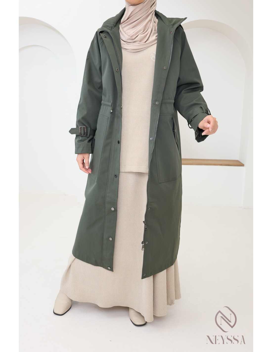 Cette Parka longue kaki pour femme voilée à la coupe moderne pudique va sans aucun doute vous plaire.