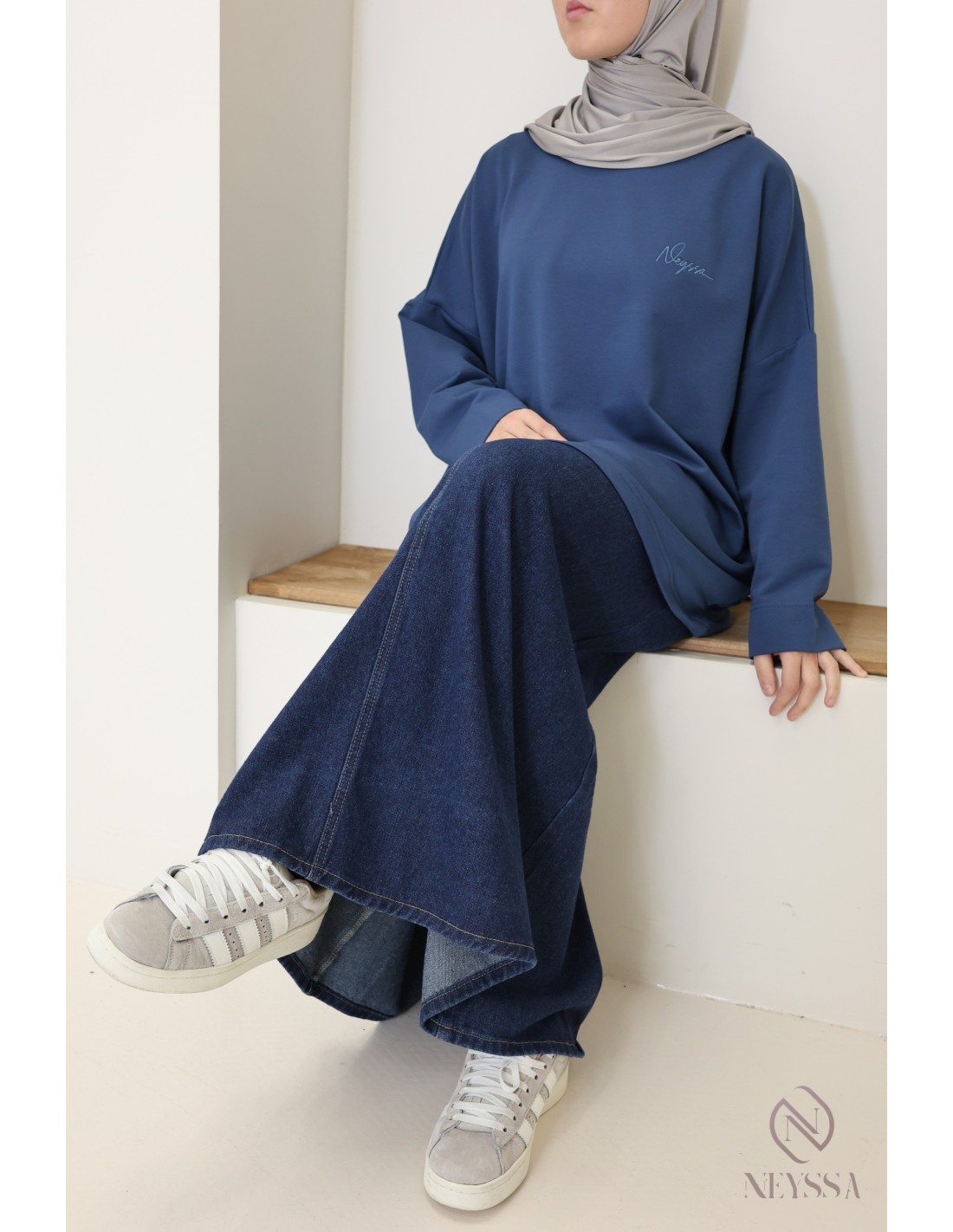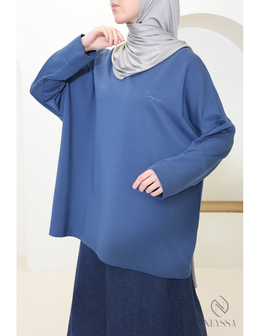 Ce t-shirt mi-long style sweat à col rond est le choix parfait pour les hijabis qui souhaitent allier mode, confort et modestie au quotidien.