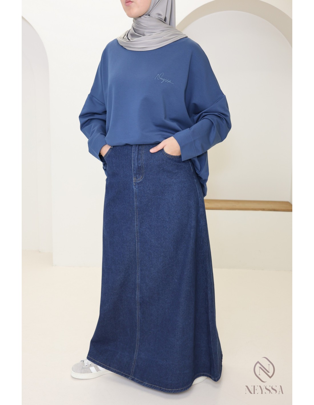 Idées de tenues avec le T-shirt bleu jean mi-long un must have femme modeste :