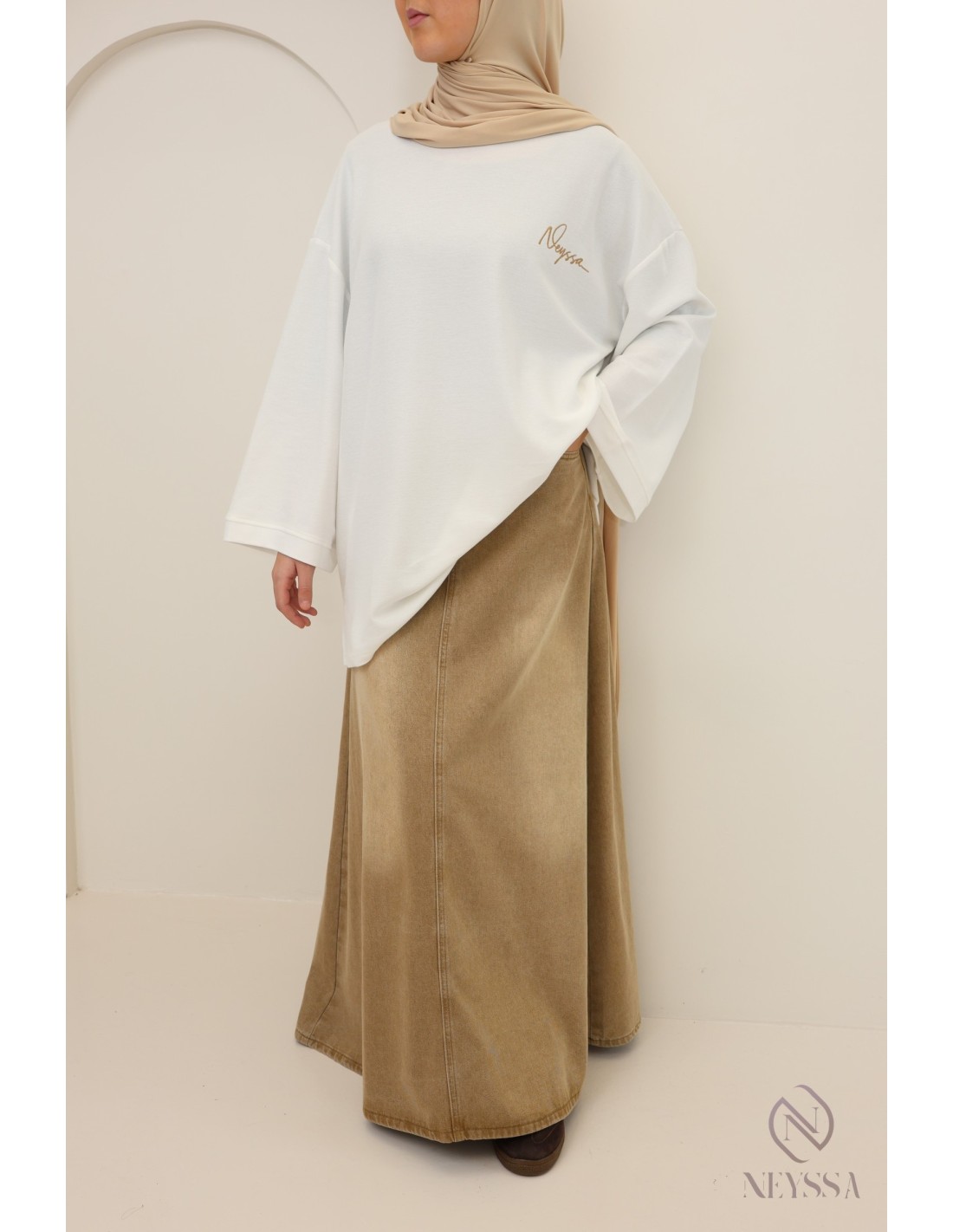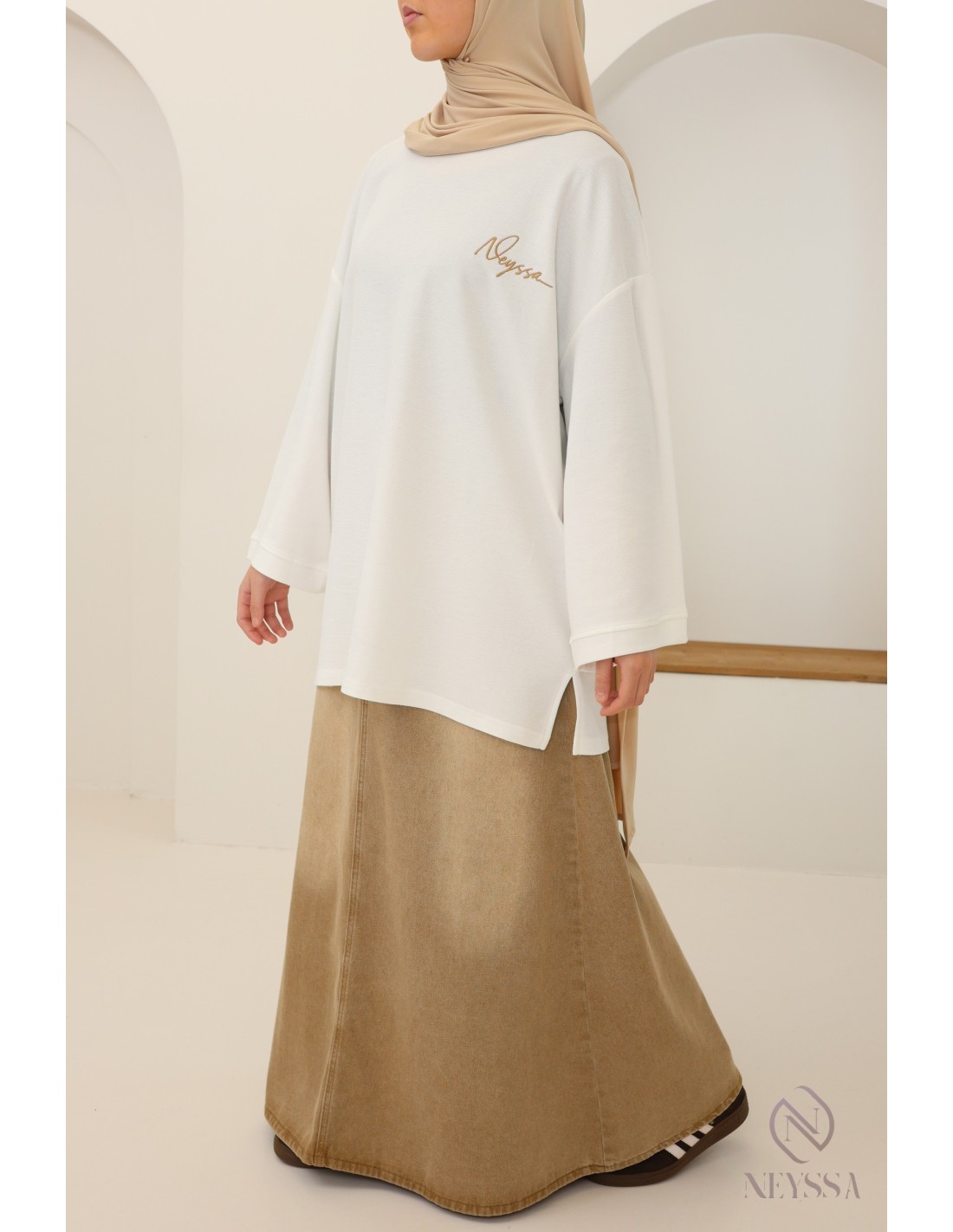 Ce t-shirt mi-long style sweat à col rond est le choix parfait pour les hijabis qui souhaitent allier mode, confort et modestie au quotidien.