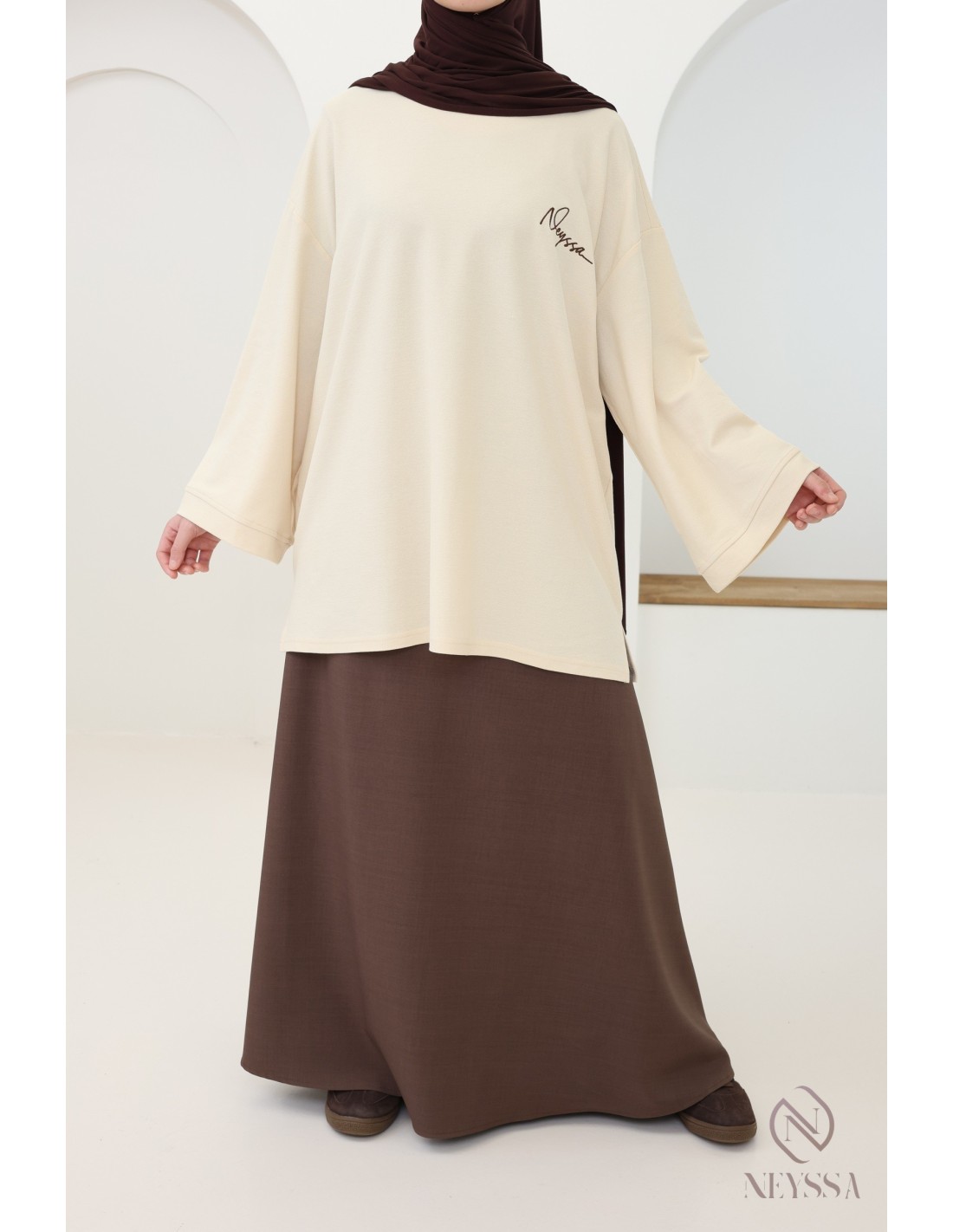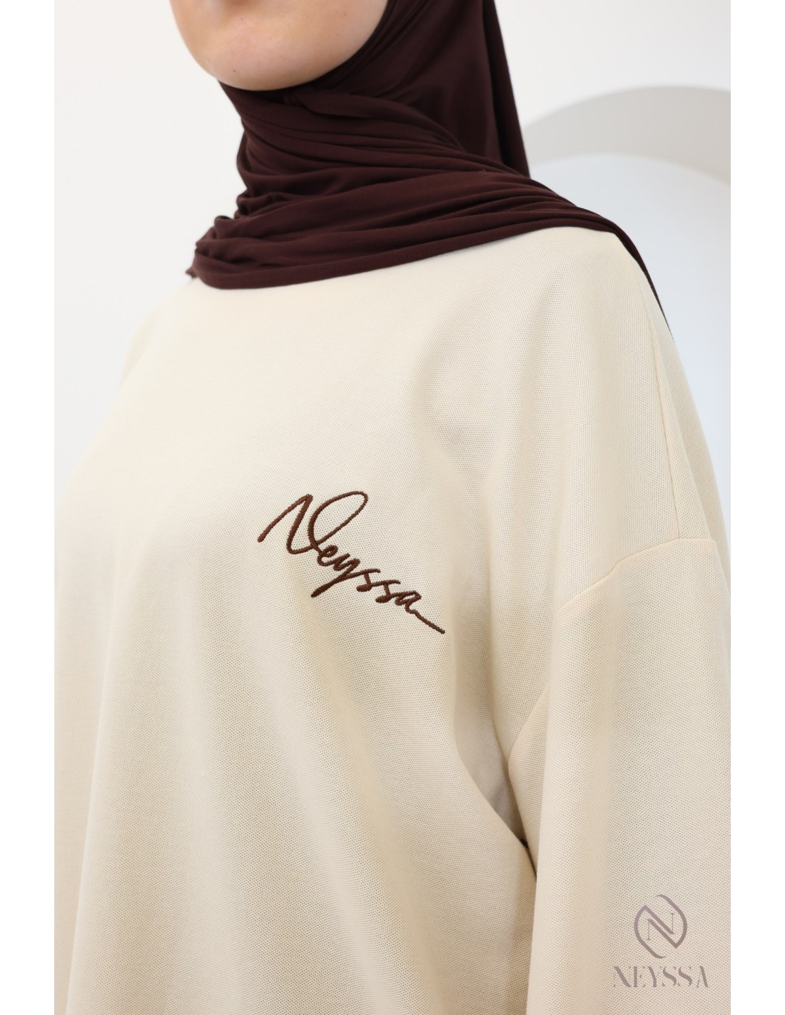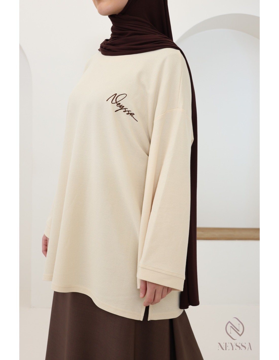 Ce t-shirt mi-long style sweat à col rond est le choix parfait pour les hijabis qui souhaitent allier mode, confort et modestie au quotidien.